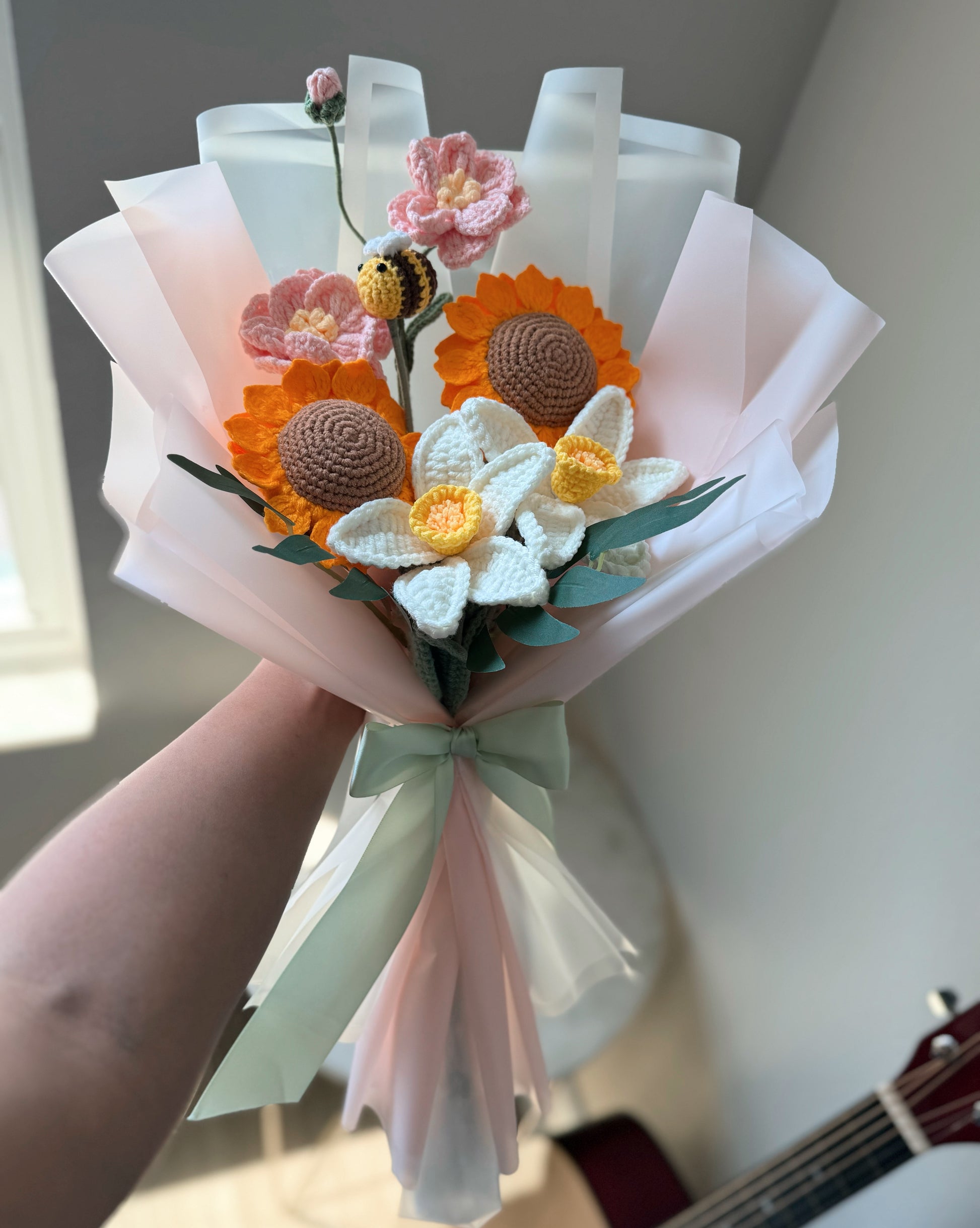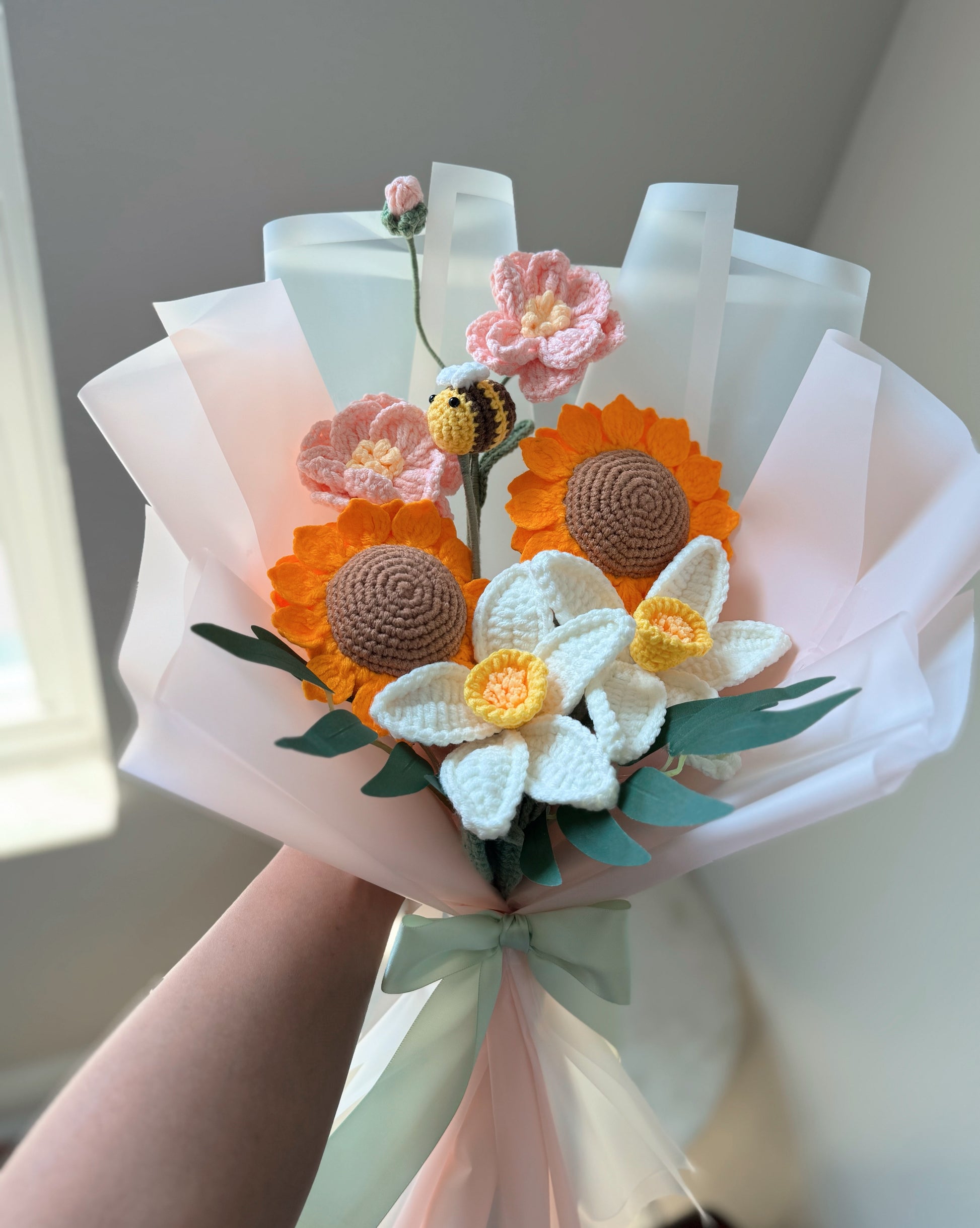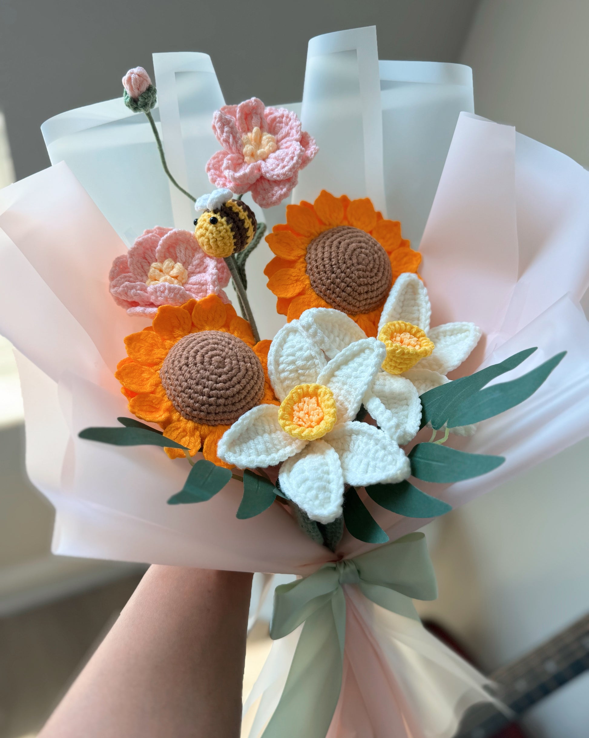A cheerful handmade crochet bouquet featuring bright sunflowers, delicate daffodils, soft pink butterfly ranunculus, and a playful little bee — wrapped with love and finished with a pastel ribbon.