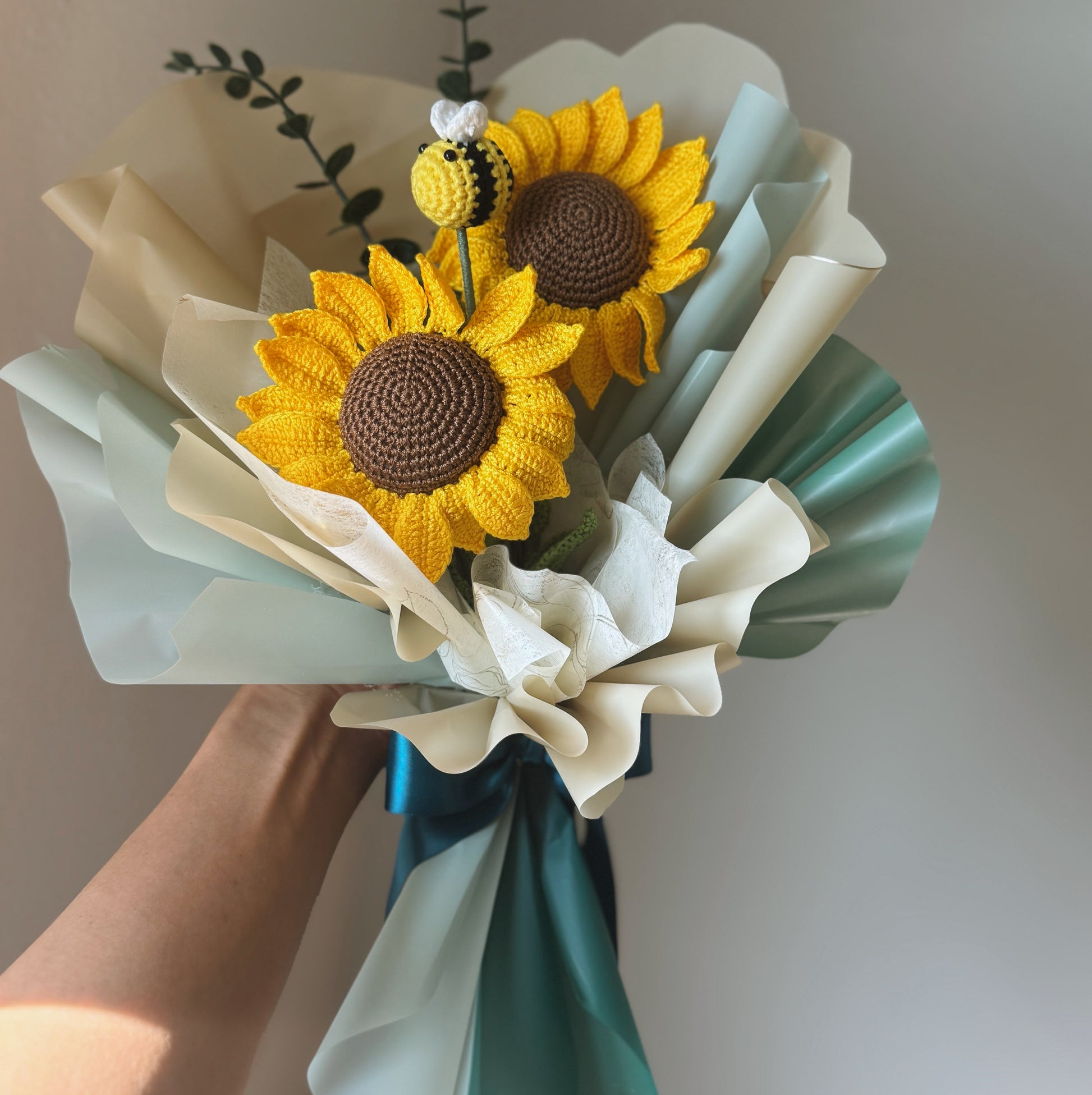 This cheerful handmade bouquet features bright, golden sunflowers paired with an adorable little bee, creating a happy and heart-warming arrangement. Sunflowers symbolize joy, positivity, and unwavering warmth, while the bee adds a touch of sweetness and togetherness.