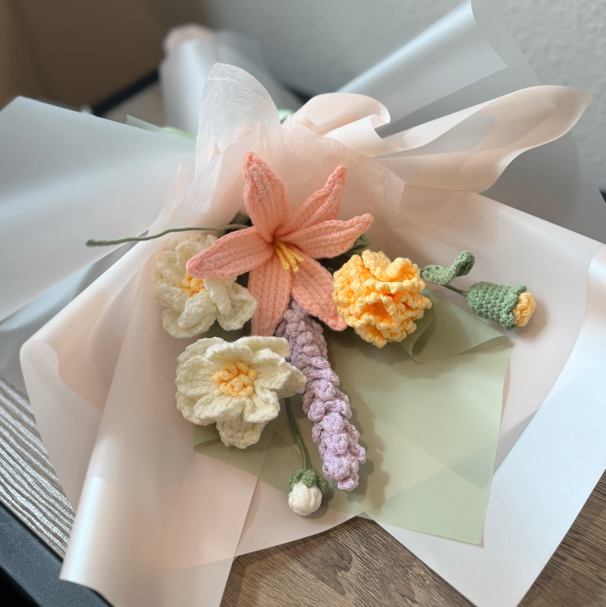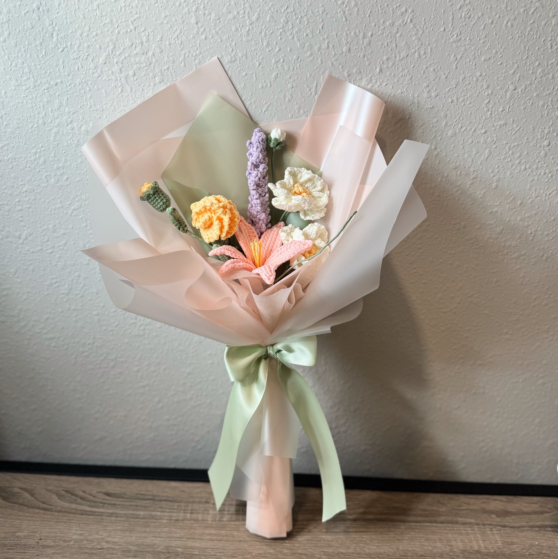 A delicate arrangement that captures soft elegance and charm. This bouquet features a blushing pink rain lily, a symbol of new beginnings, alongside a graceful stem of light purple lavender, known for calm and serenity. A cheerful yellow carnation brings joy and warmth, while the white butterfly ranunculus adds a touch of purity and romance. Wrapped in pastel tones with a satin bow, this bouquet radiates gentle beauty — perfect for thoughtful gifts, celebrations, or simply brightening someone’s day.