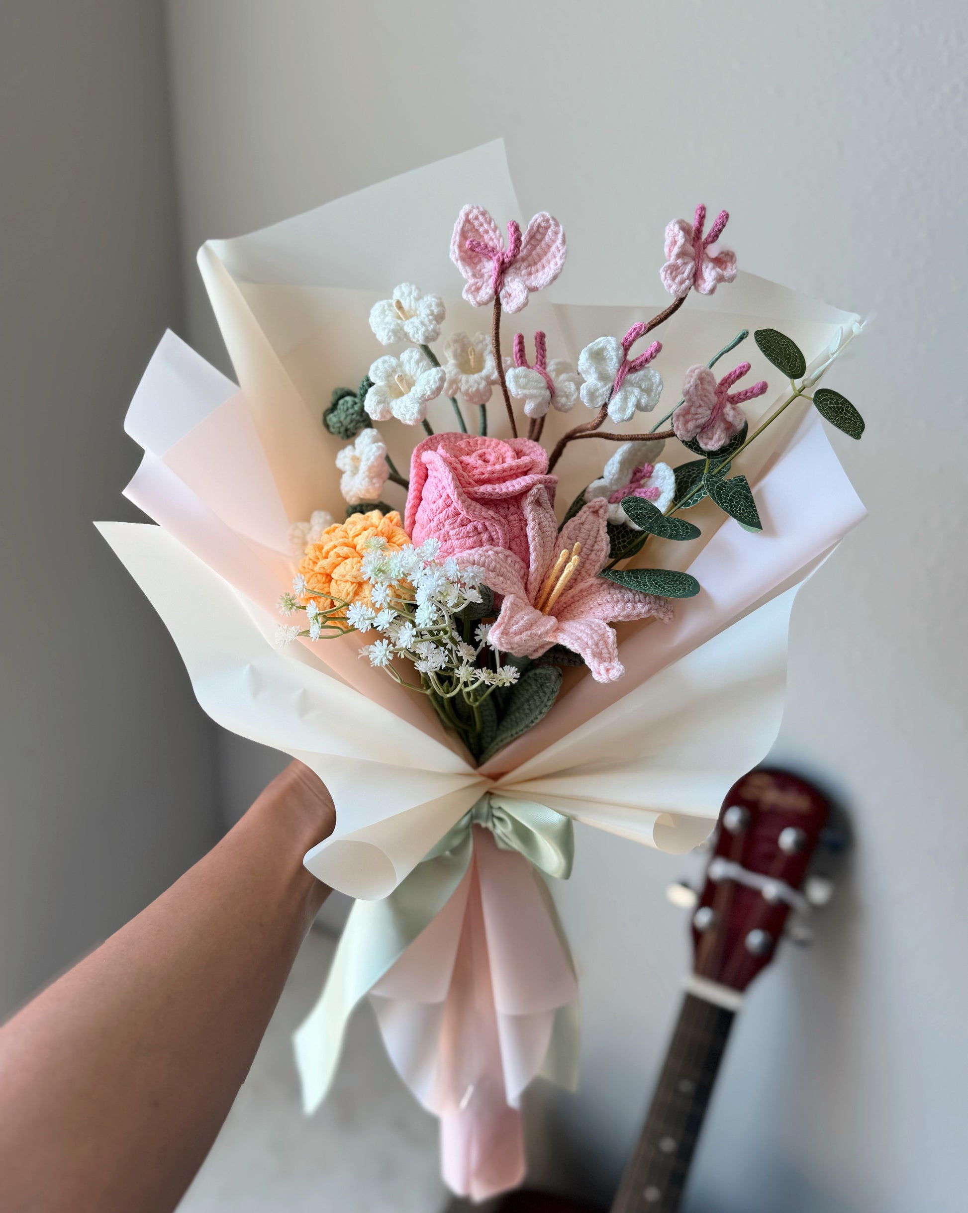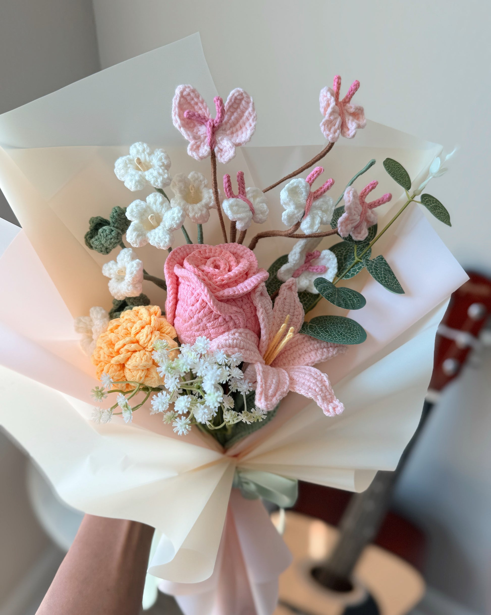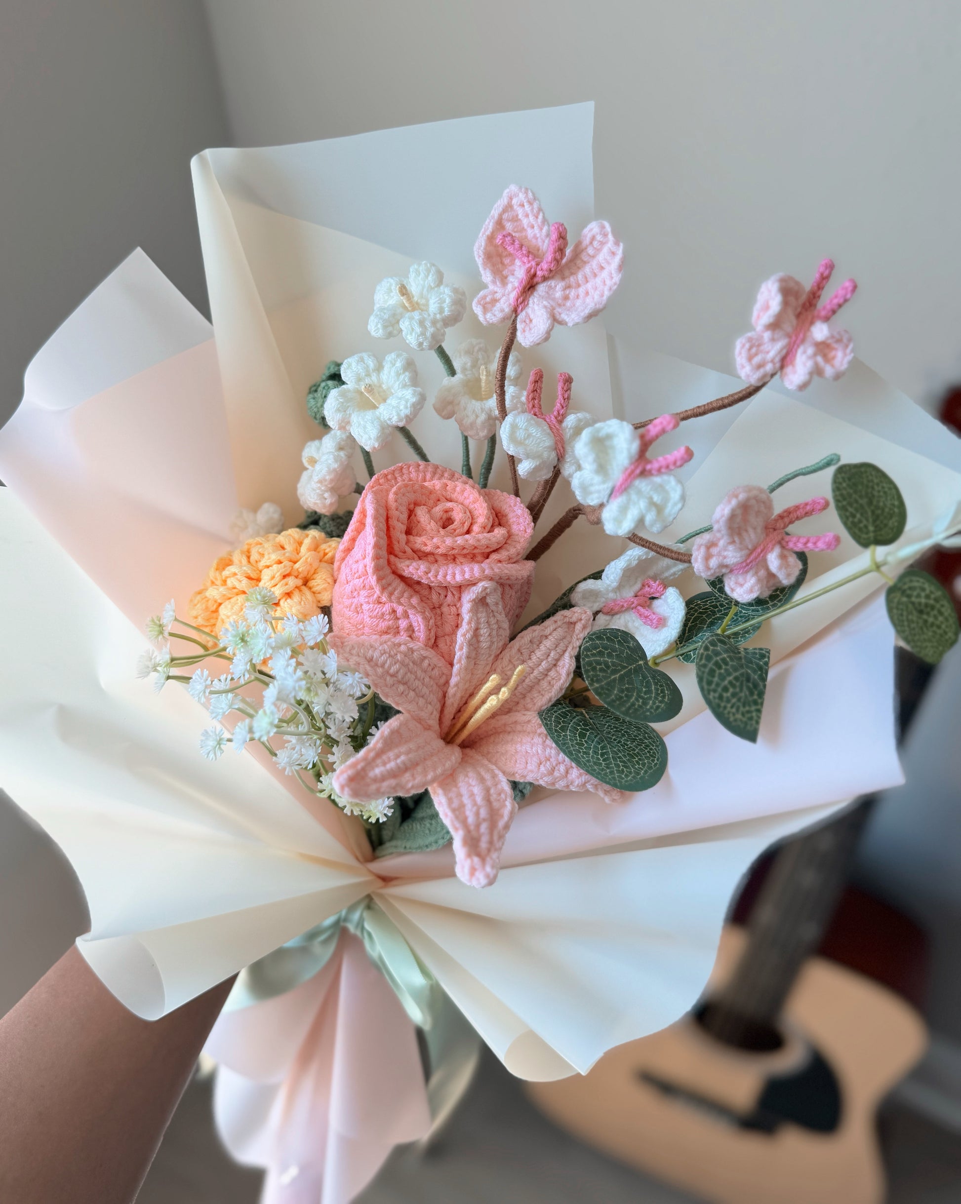 This dreamy handmade crochet bouquet brings together soft romance and cheerful charm. At its heart, a delicate pink rose and a graceful pink rain lily bloom with elegance, surrounded by a sunny yellow marigold that adds a touch of warmth and joy. Clusters of white oxalis flowers bring gentle purity, while fluttering pink butterflies dance playfully above, adding a whimsical finish. Wrapped in soft pastel paper and tied with a satin ribbon, this bouquet is a celebration of love, light, and serenity—perfect for brightening any space or gifting with heartfelt meaning.