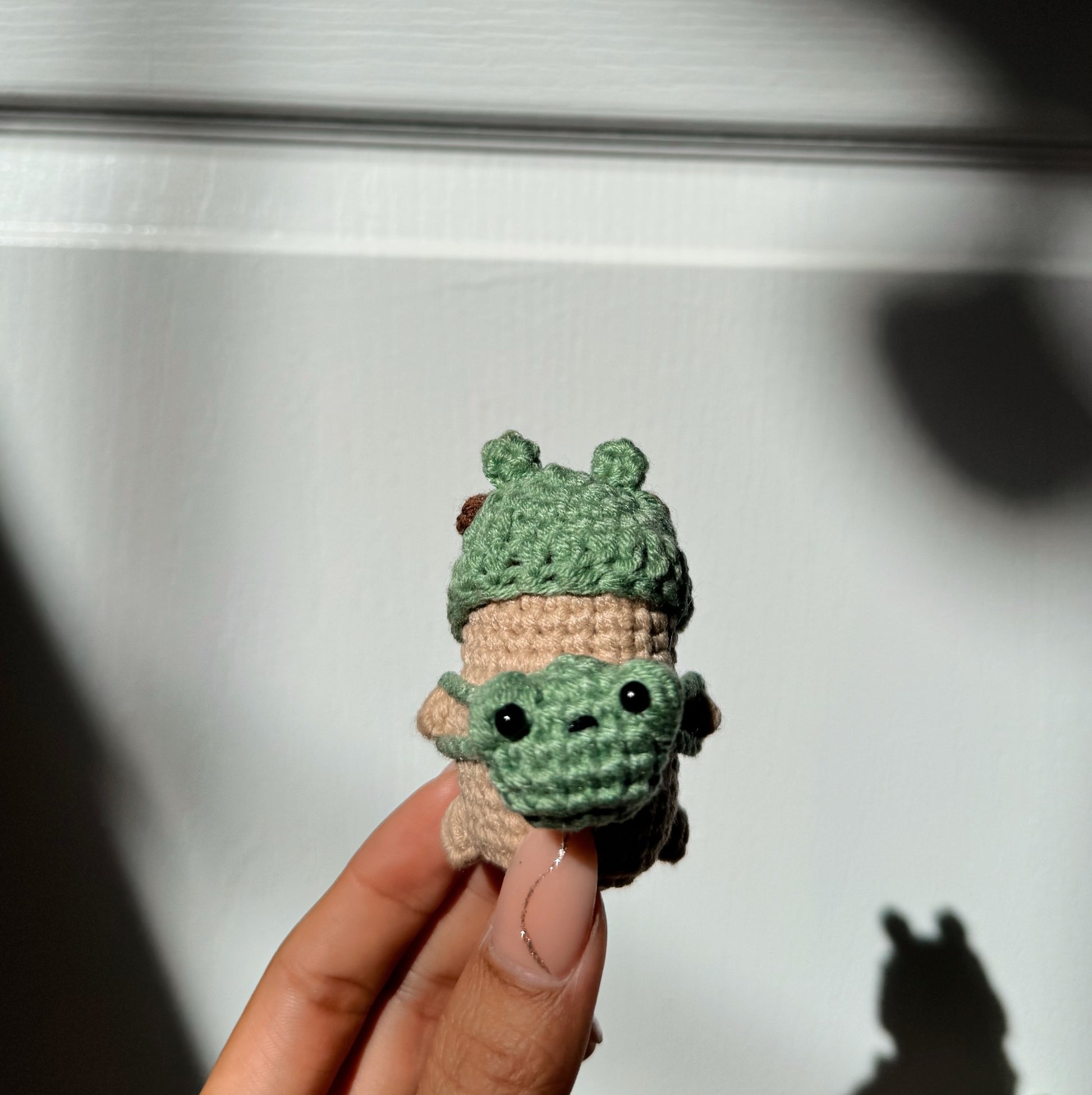 A crochet capybara with a frog backpack and frog hat is a cute and fun handmade creation. It features a soft, plush capybara wearing a frog-shaped hat and carrying a matching frog backpack. With its sweet face and playful accessories, this design is perfect as a gift, decoration, or collectible. Simple and adorable, it’s sure to bring a smile to anyone who sees it!