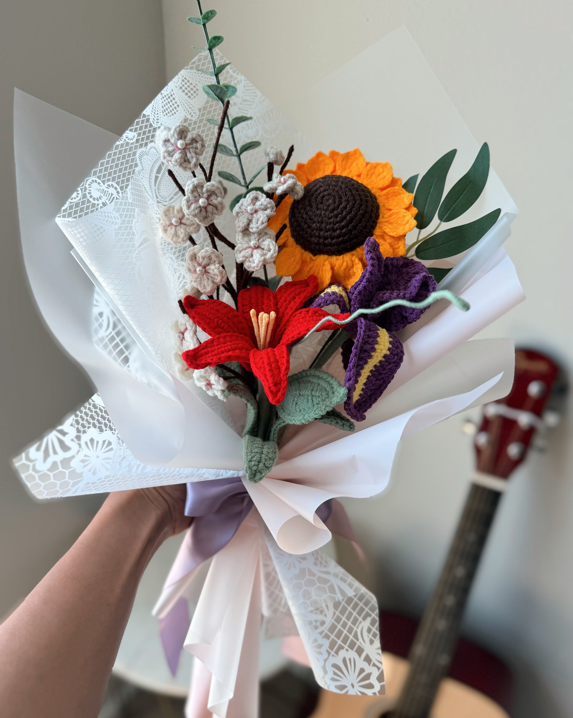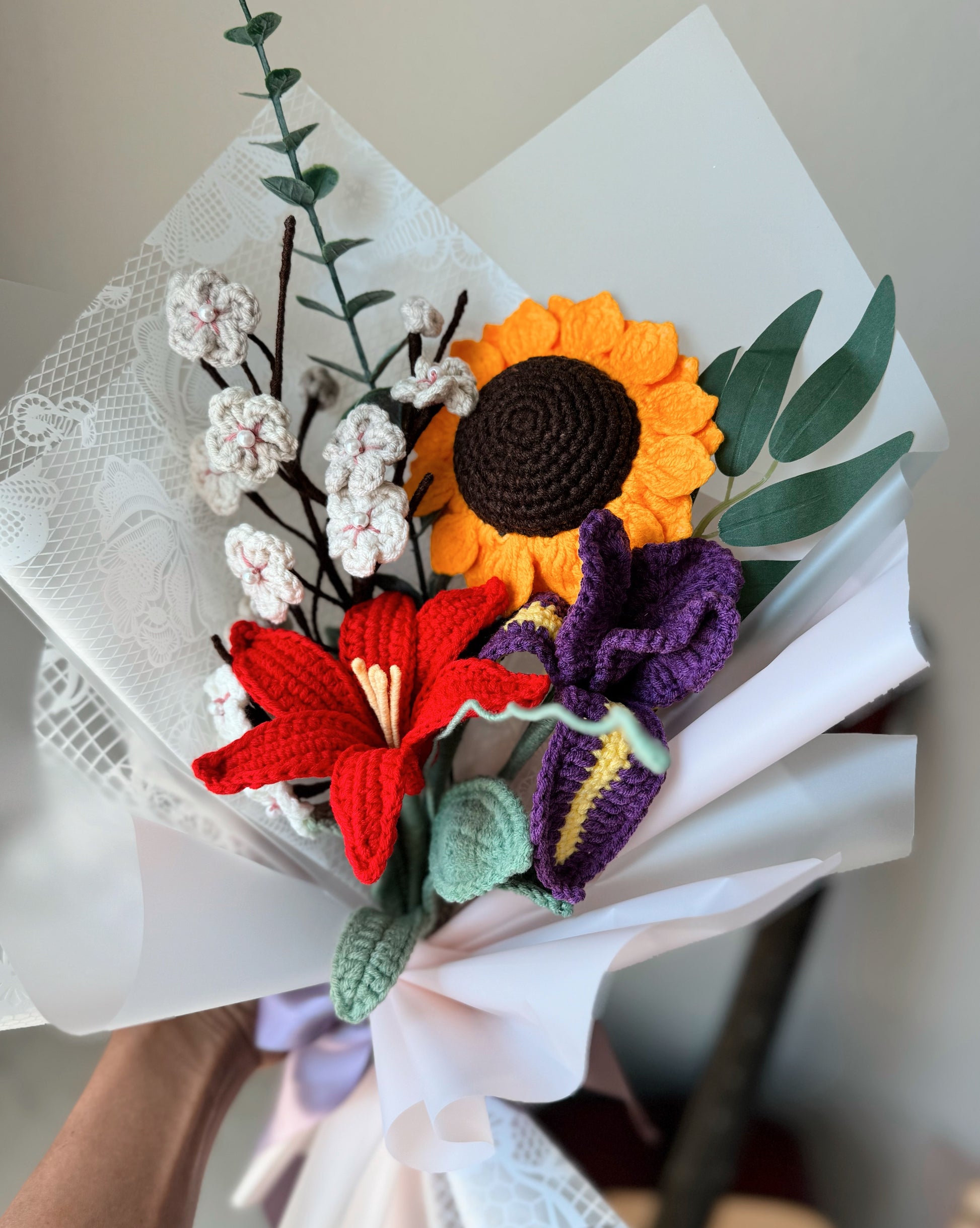 This vibrant crochet bouquet radiates energy and joy. A bold red rain lily adds passion and strength, while the purple iris brings depth and elegance. The sunflower shines brightly at the center, symbolizing happiness and positivity, beautifully balanced by delicate neutral sakura blossoms that soften the arrangement with grace. Wrapped in lace-textured paper and tied with satin ribbons, this bouquet feels both cheerful and sophisticated—perfect for gifting warmth, love, and celebration.