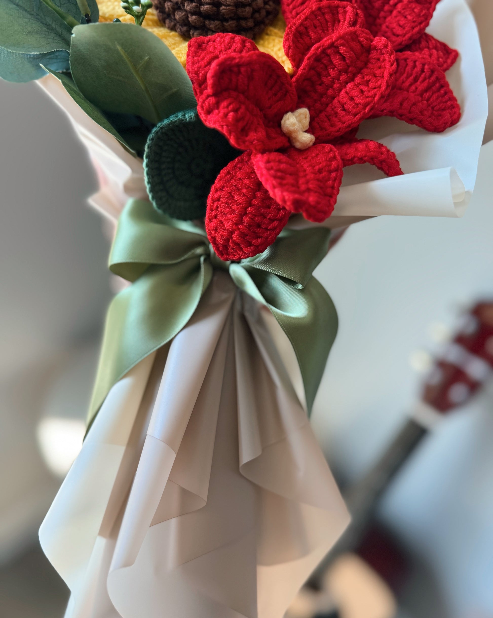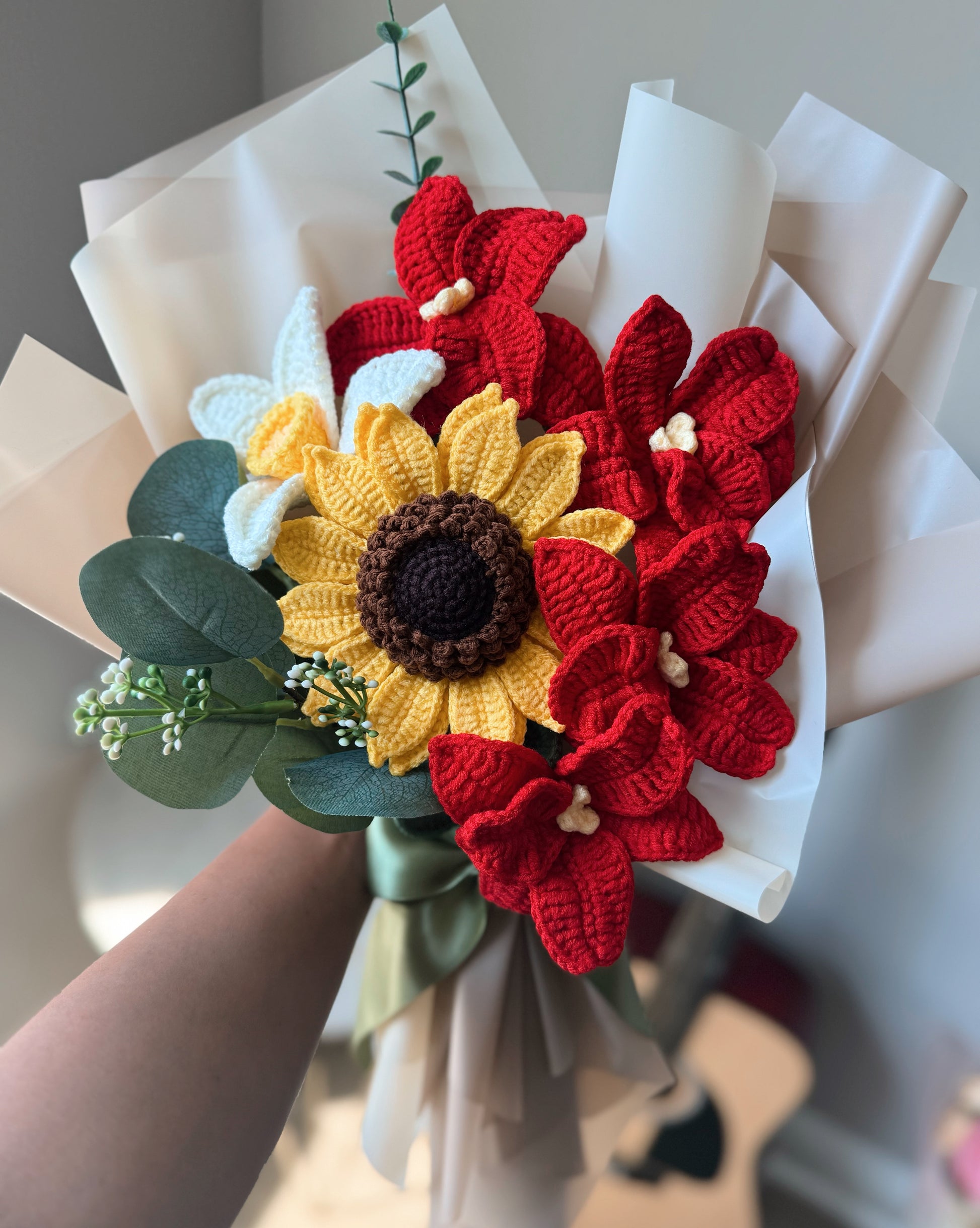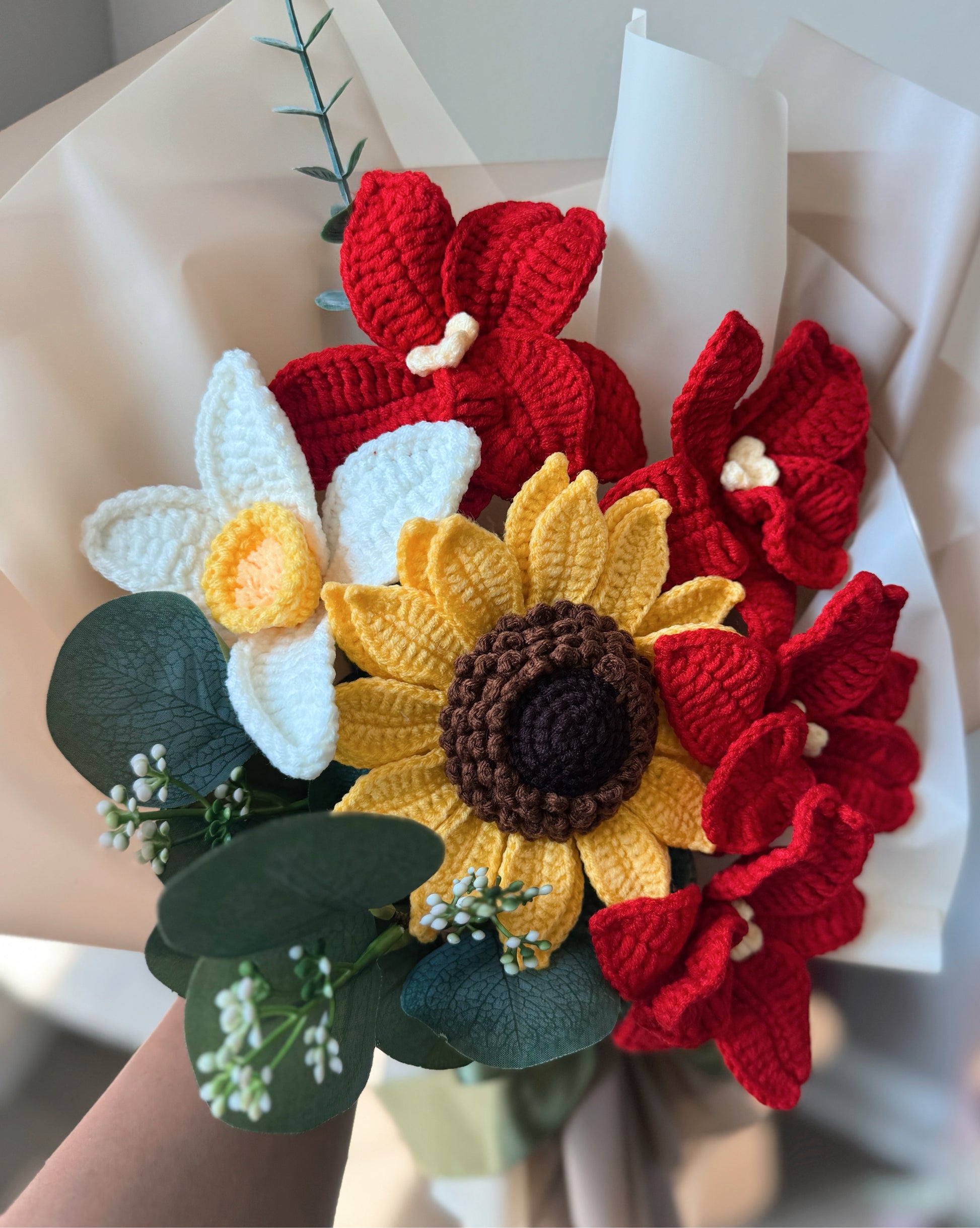 A bold and radiant handmade crochet bouquet featuring a bright sunflower at its heart, surrounded by elegant red orchids and a delicate white daffodil. Finished with lush greenery and wrapped in soft tones, this bouquet captures warmth, strength, and timeless beauty.