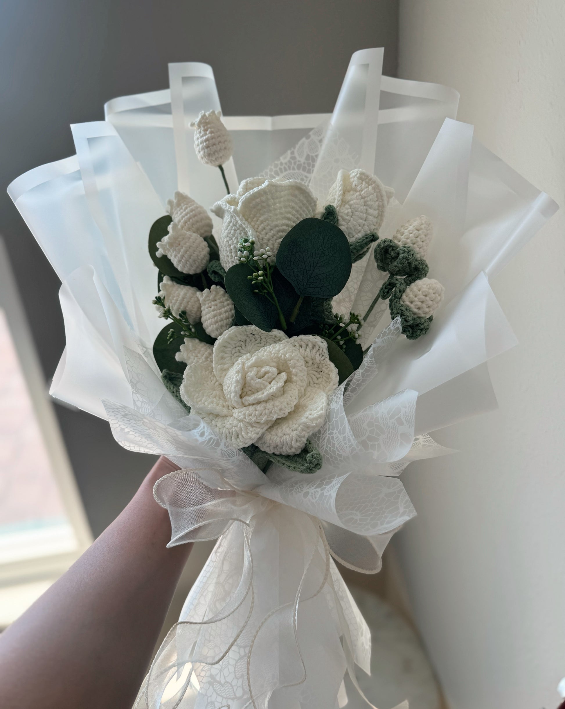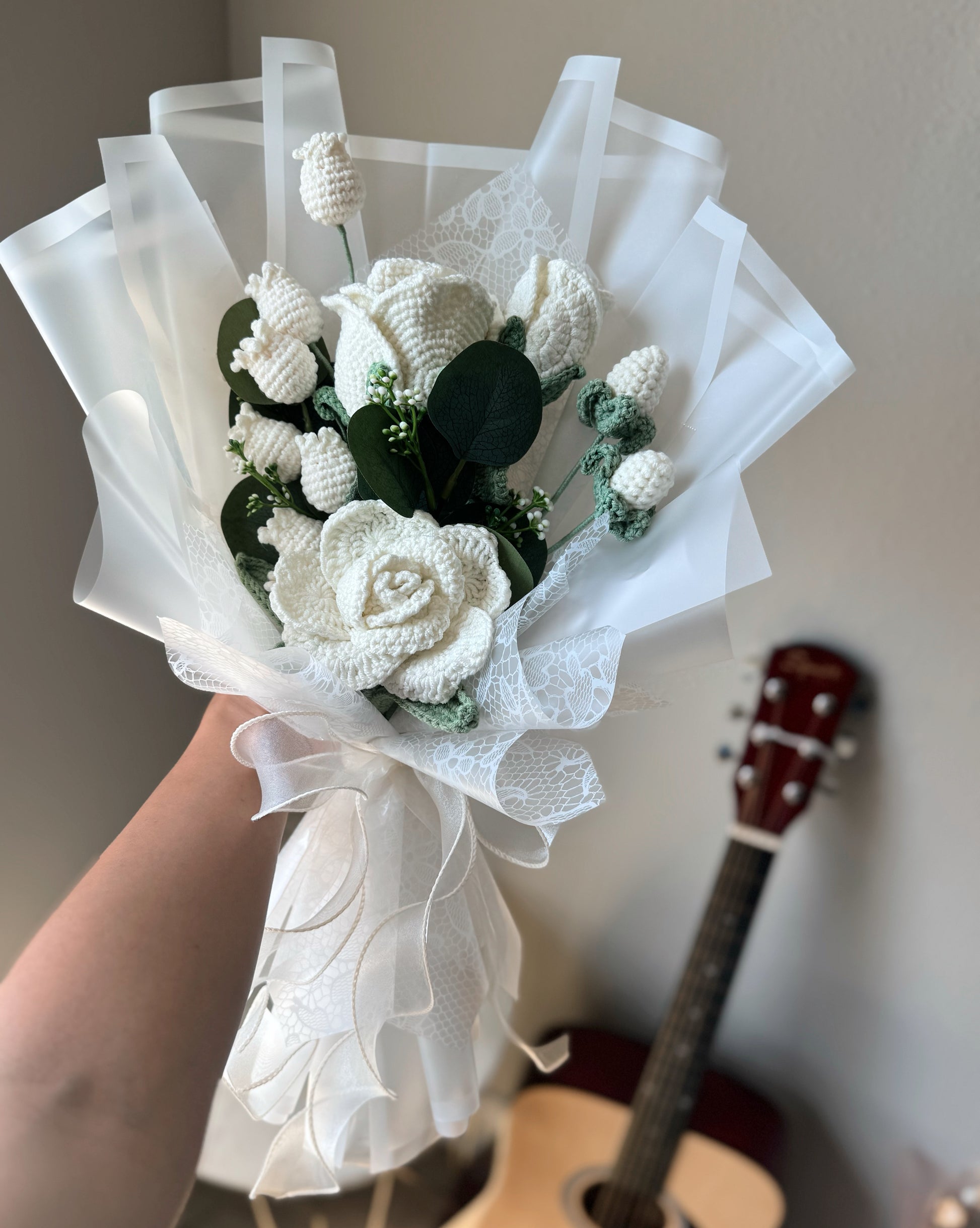 A timeless all-white crochet bouquet featuring elegant white roses paired with delicate white Canterbury bells. Wrapped in sheer lace and soft white layers, this arrangement embodies purity, grace, and everlasting charm — perfect for weddings, anniversaries, or heartfelt gestures. 🤍✨🌿