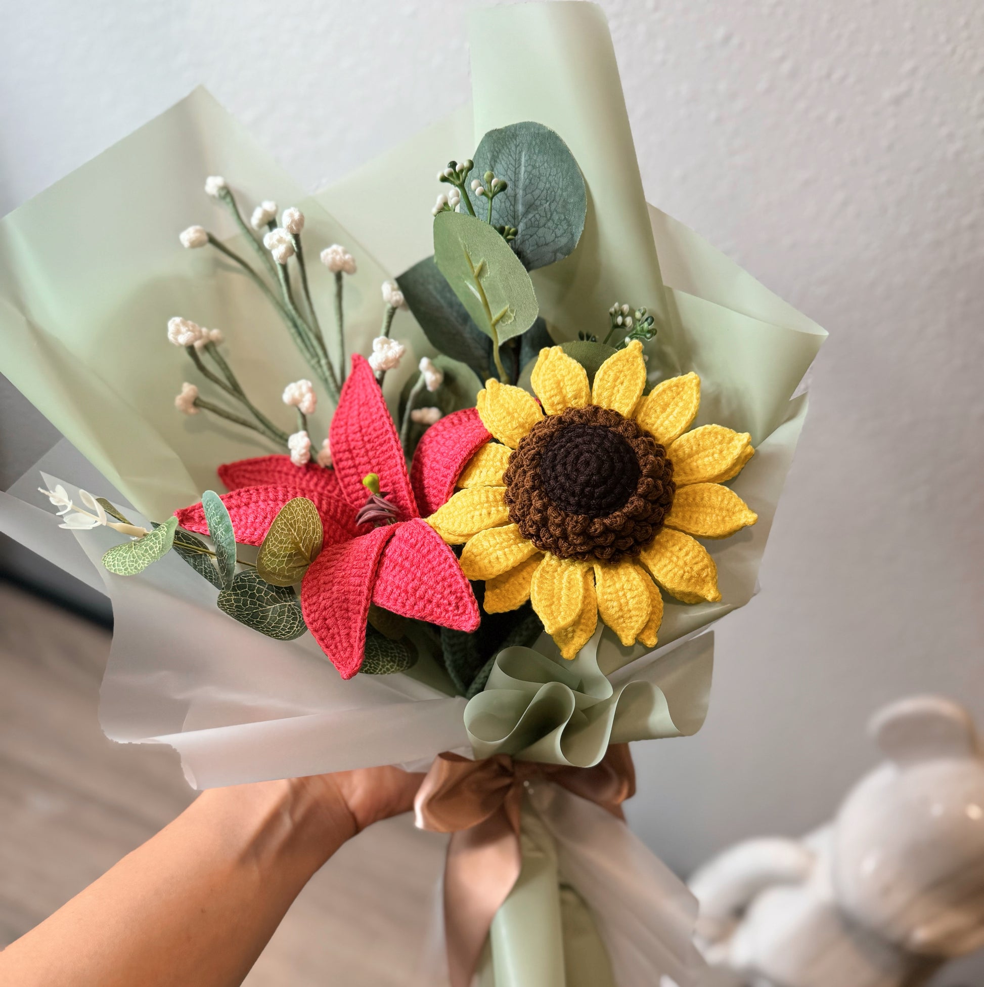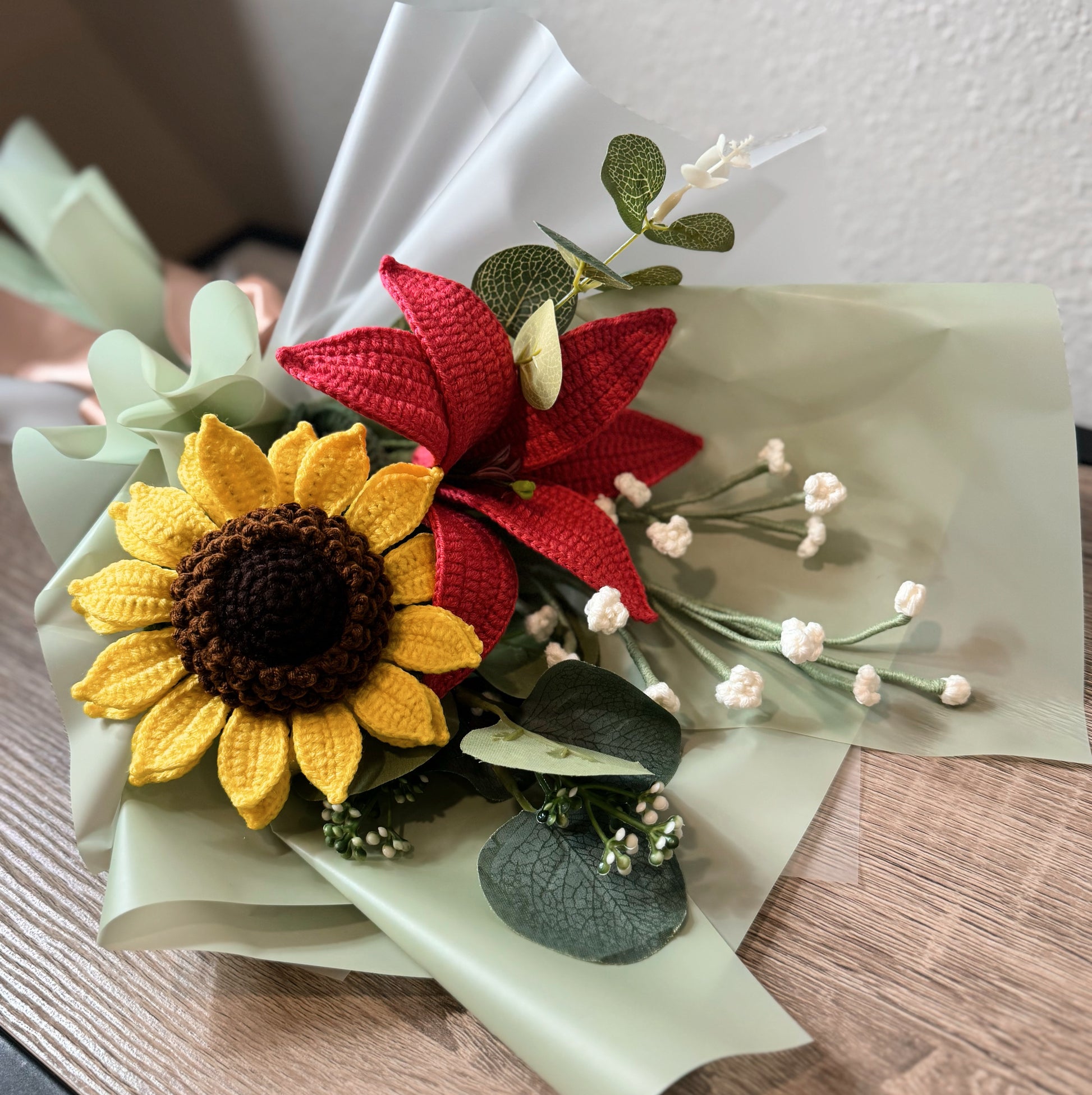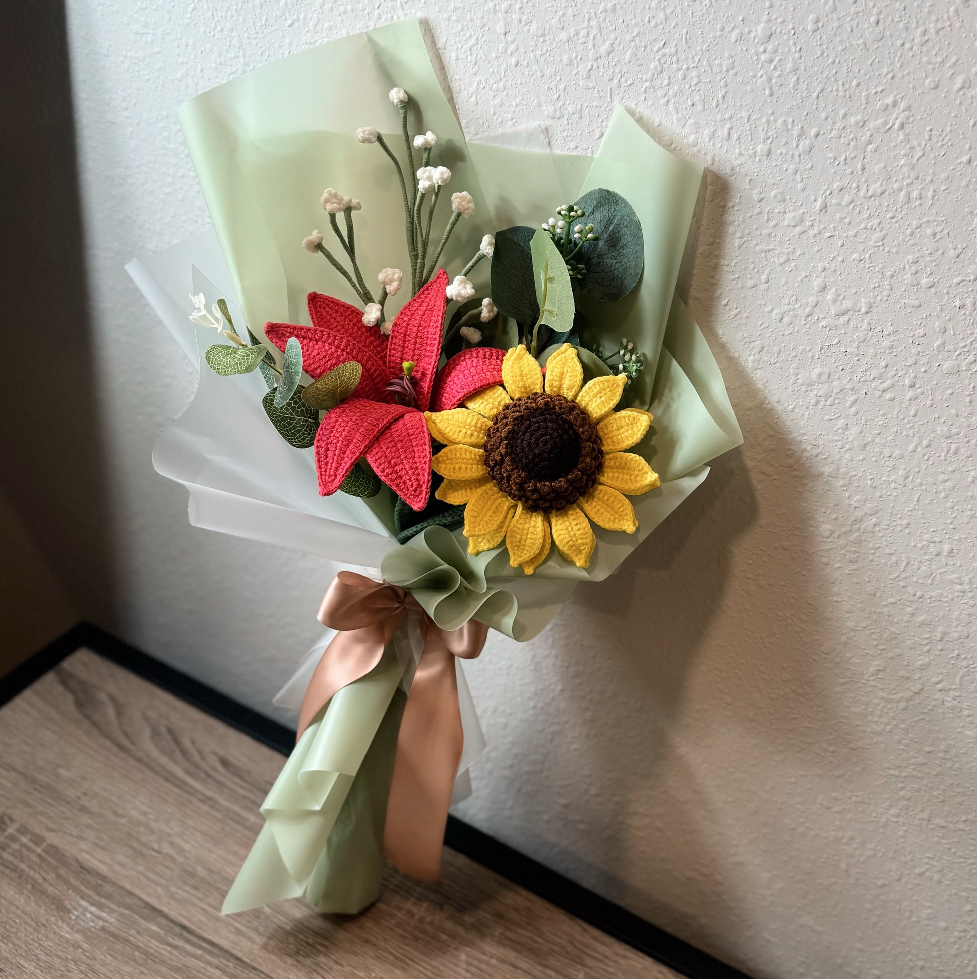 This charming bouquet features a vibrant sunflower paired with a graceful dark pink lily, blending cheerfulness with elegance. The sunflower radiates warmth, positivity, and happiness, while the lily adds a touch of sophistication and admiration. Accented with soft baby’s breath and greenery, this bouquet is both lively and refined — a perfect choice to brighten someone’s day or mark a heartfelt occasion.