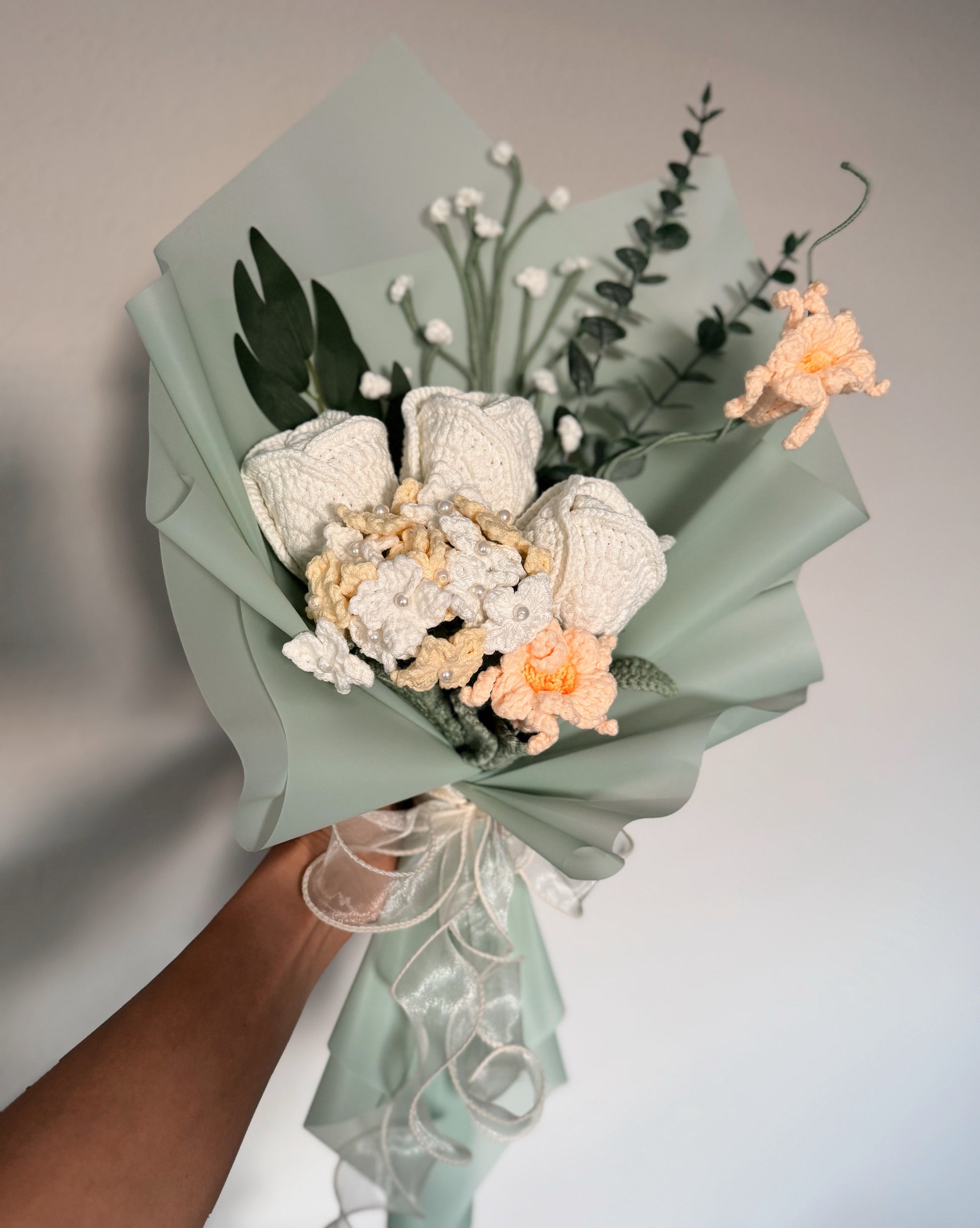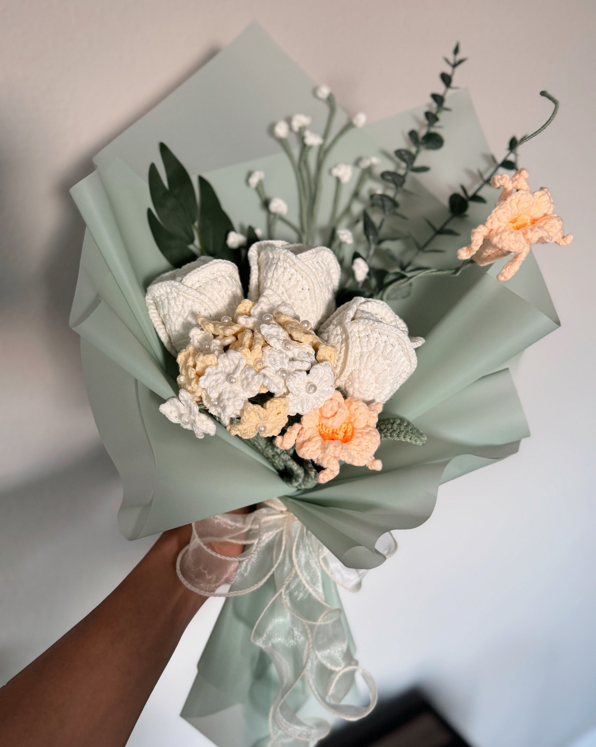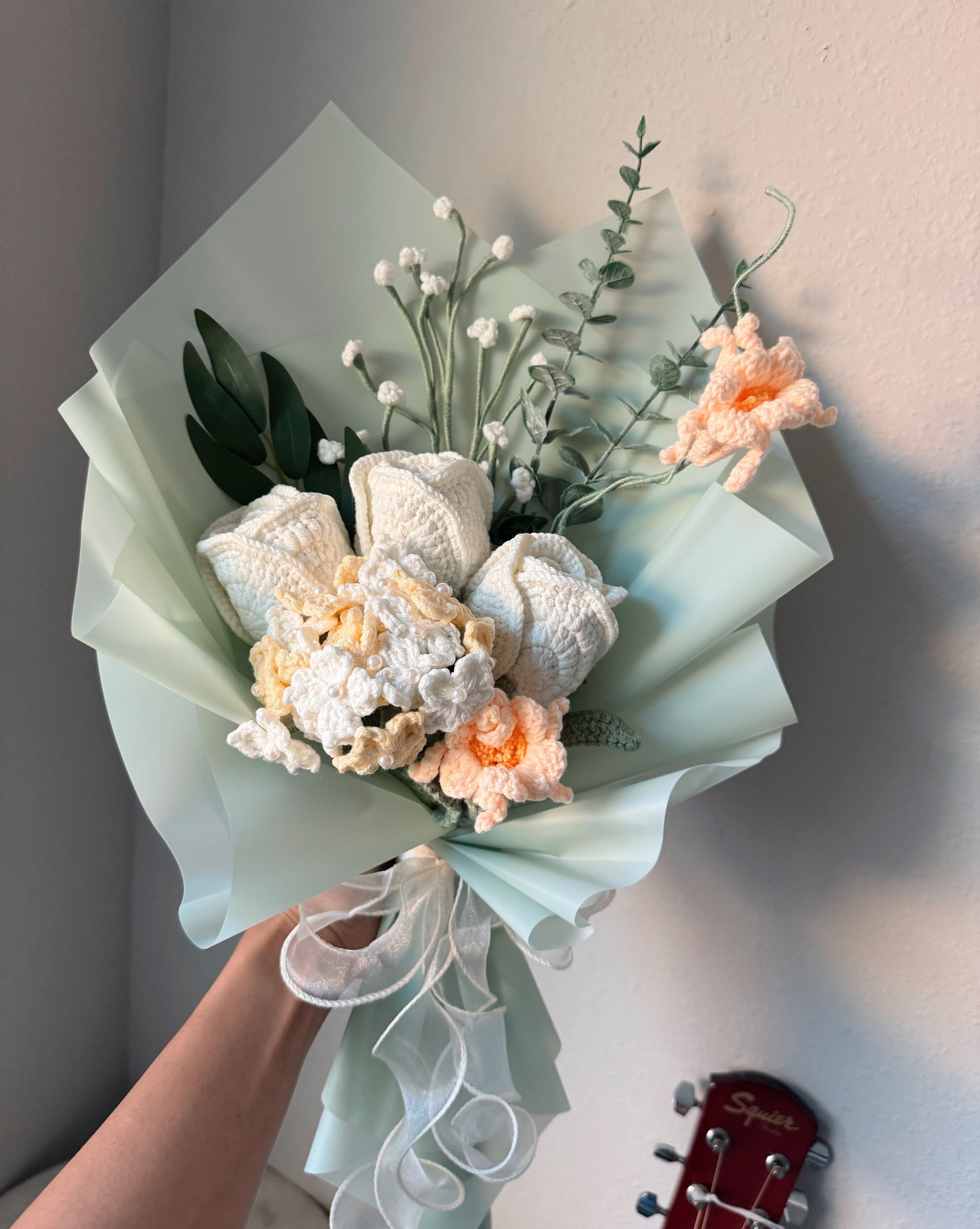 This elegant crochet bouquet glows with purity and warmth. At its heart are delicate white roses, timeless symbols of love and grace. Surrounding them, clusters of yellow and white hydrangeas bring a gentle brightness, while the striking yellow Peruvian daffodil adds a touch of cheer and golden light. Wisps of white gypsophila finish the arrangement with a soft, airy charm. Wrapped in mint-green paper and tied with a sheer ribbon, this bouquet feels fresh, serene, and full of quiet joy—perfect for expressing heartfelt blessings and new beginnings. 🌿🤍✨