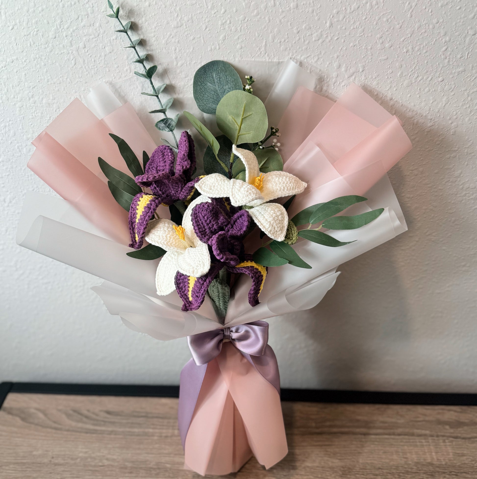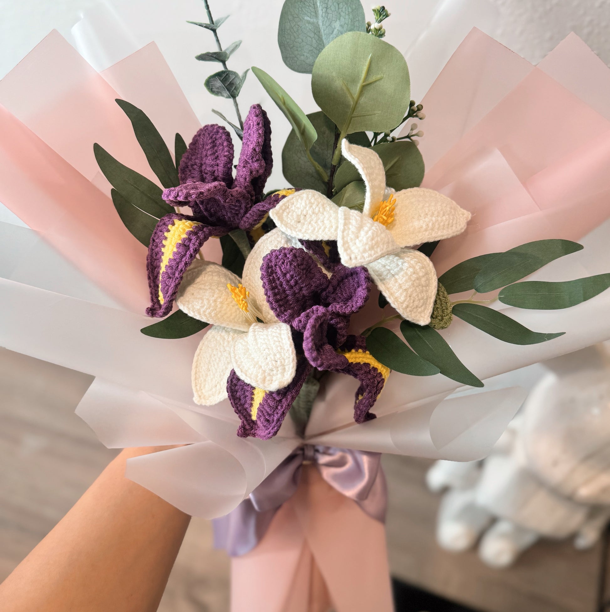 This bouquet features a graceful pairing of white lilies and deep purple irises, beautifully accented with lush greenery. The crisp white petals bring a sense of purity and elegance, while the rich purple tones add depth and sophistication. Wrapped in soft blush and clear paper with a satin lavender bow, this arrangement radiates timeless charm—perfect for any meaningful occasion.