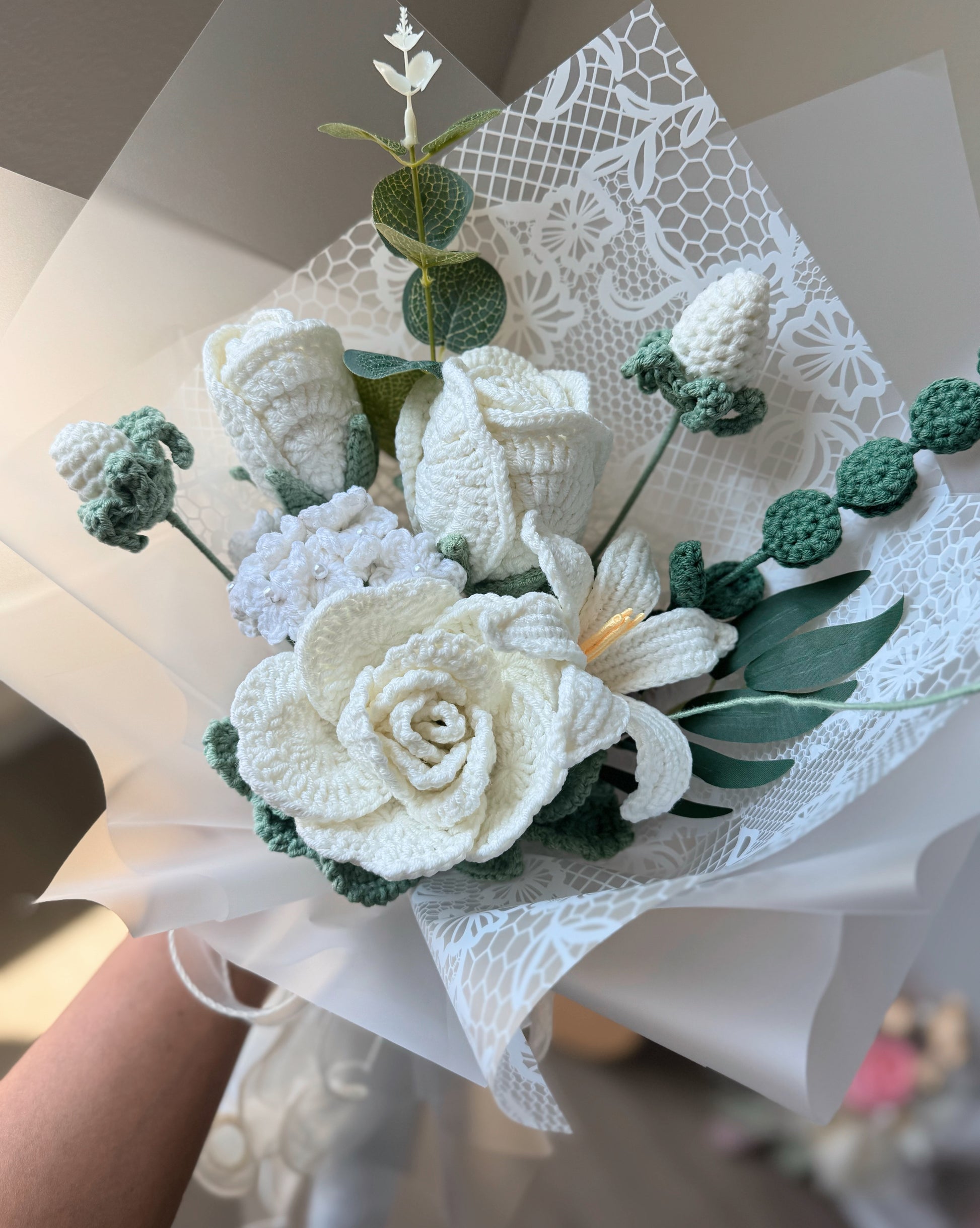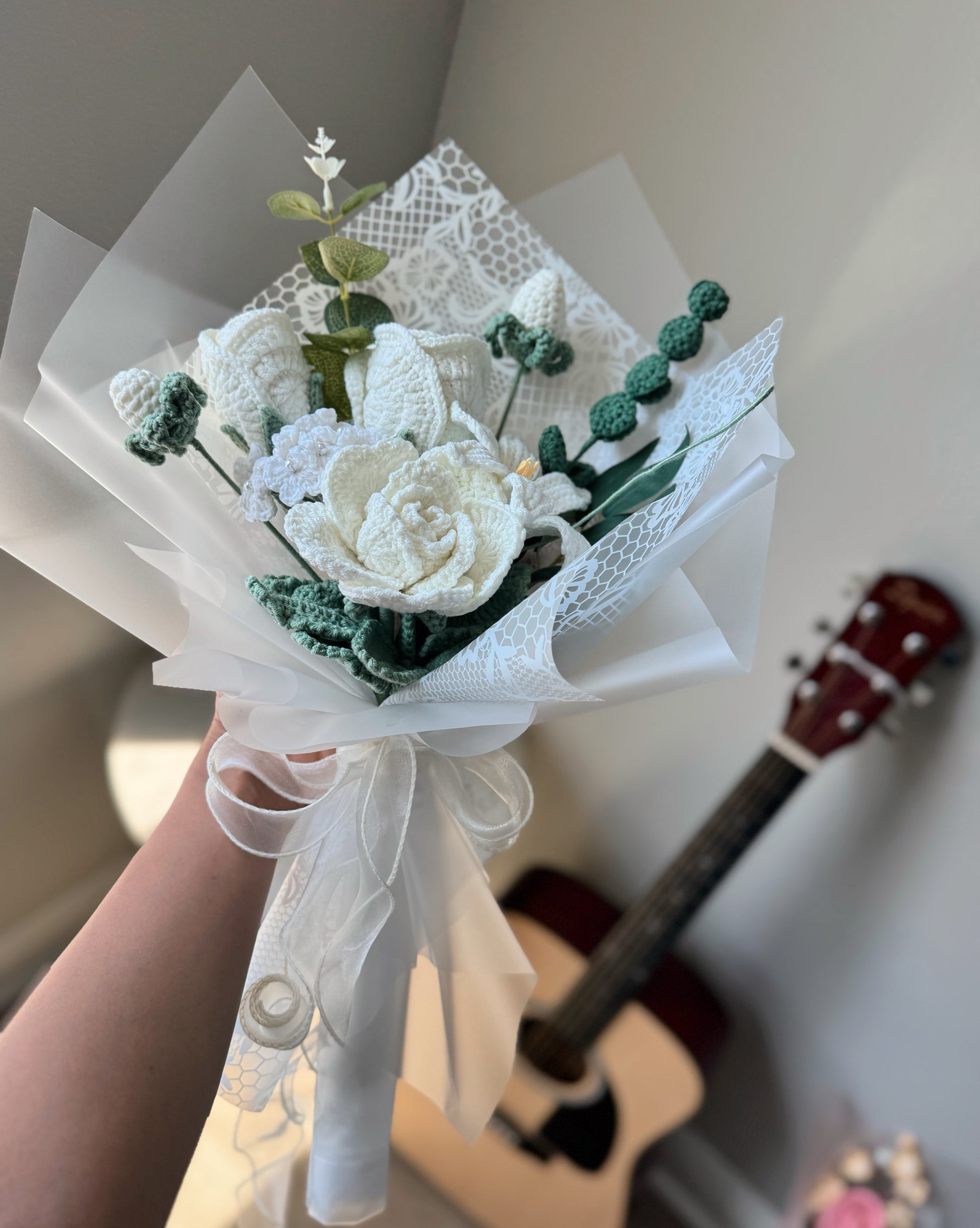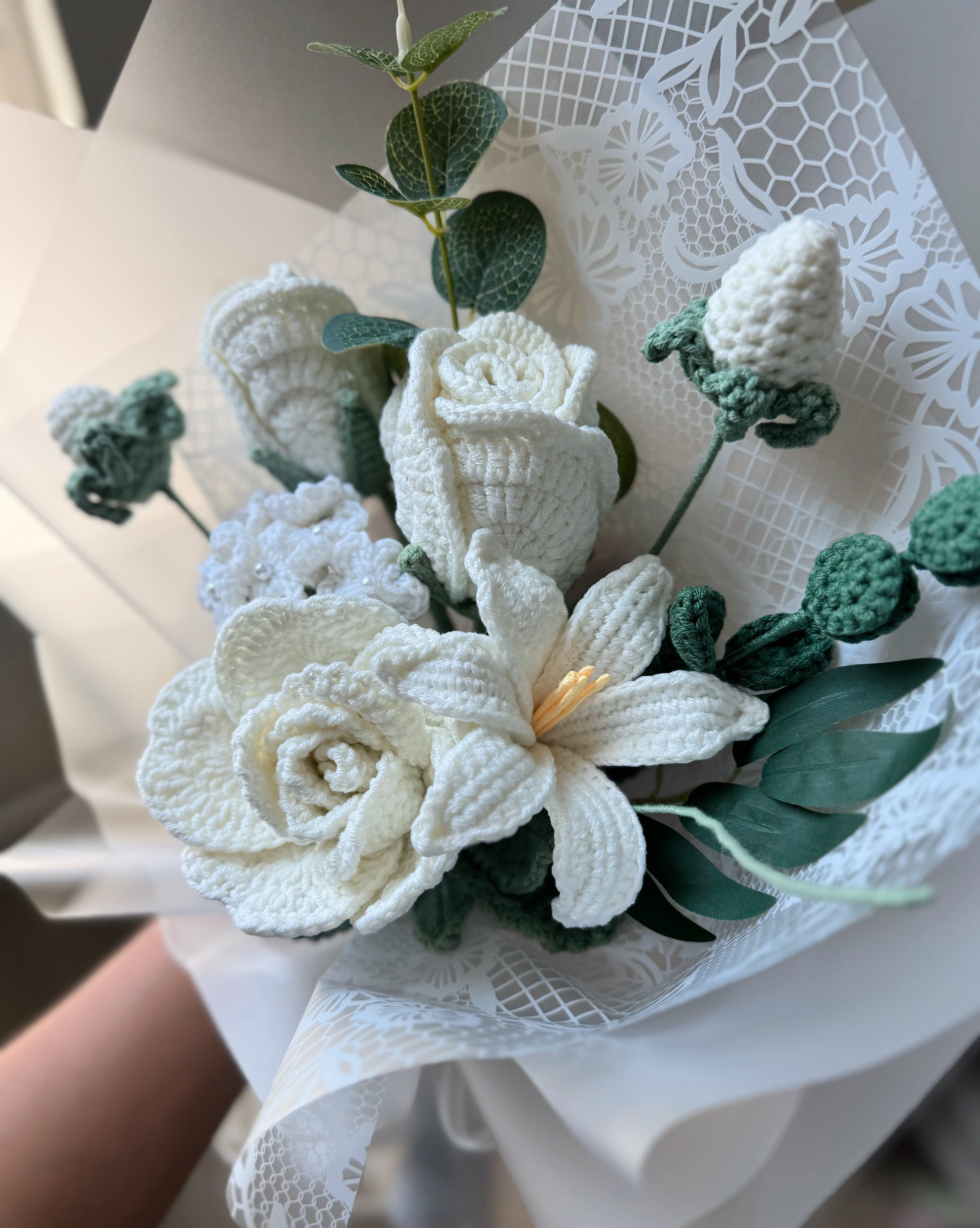 A timeless handmade crochet bouquet featuring elegant white roses, delicate white forget-me-nots, and graceful white rain lilies. Wrapped in soft lace and satin, this bouquet captures purity, serenity, and classic beauty — perfect for weddings, anniversaries, or meaningful keepsakes. 🤍✨