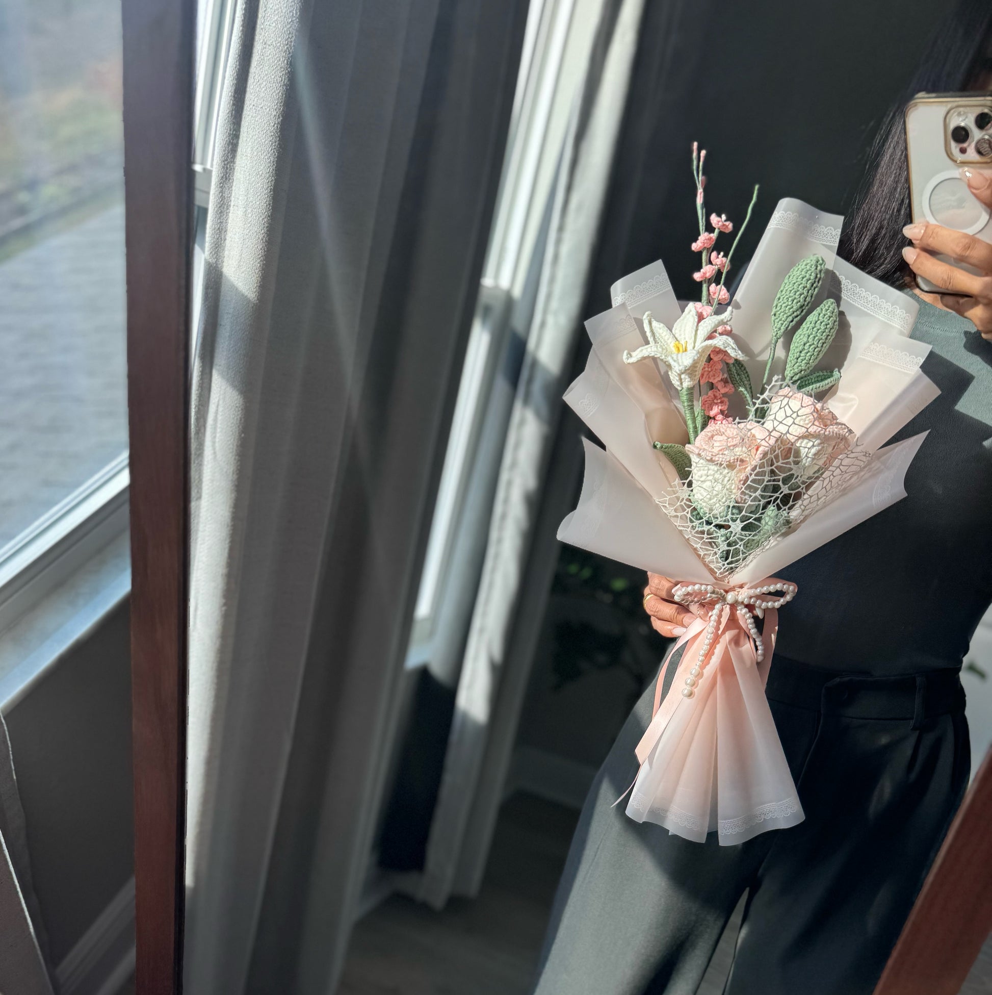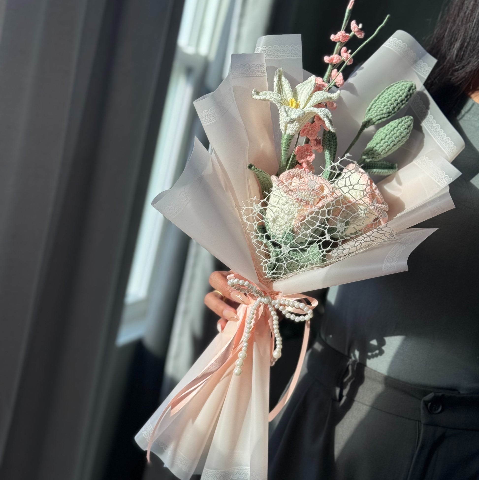 This handcrafted crochet bouquet is a delicate blend of romance and elegance. Featuring soft pink dancing lady orchids, a graceful white rain lily, tender tulip buds, and cream-white roses kissed with blush edges, each bloom is carefully stitched to create a timeless keepsake. A beautiful everlasting arrangement that captures the charm of a blooming garden — perfect for gifting or treasuring forever. 🌸