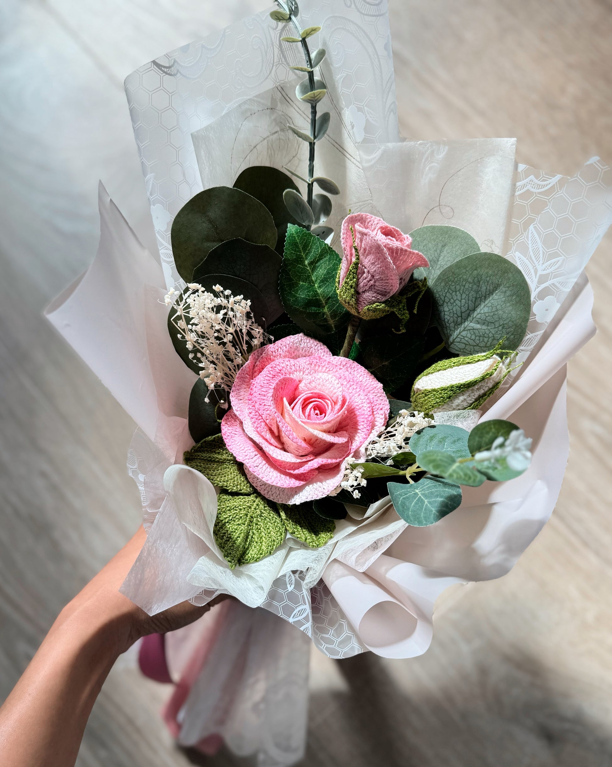 A soft and romantic arrangement featuring detailed crochet pink roses, delicate greenery, and gentle white accents — all wrapped in dreamy blush tones. This bouquet brings a feeling of calm, sweetness, and quiet beauty, perfect for gifting or brightening your own space.