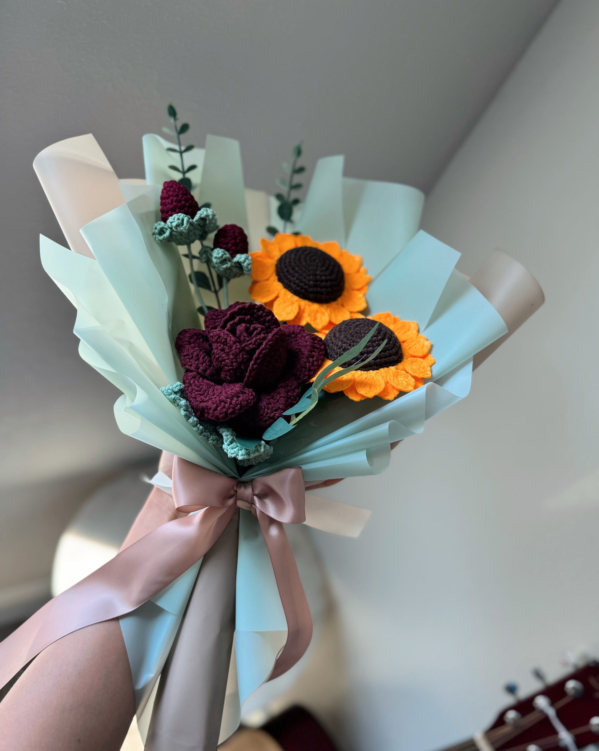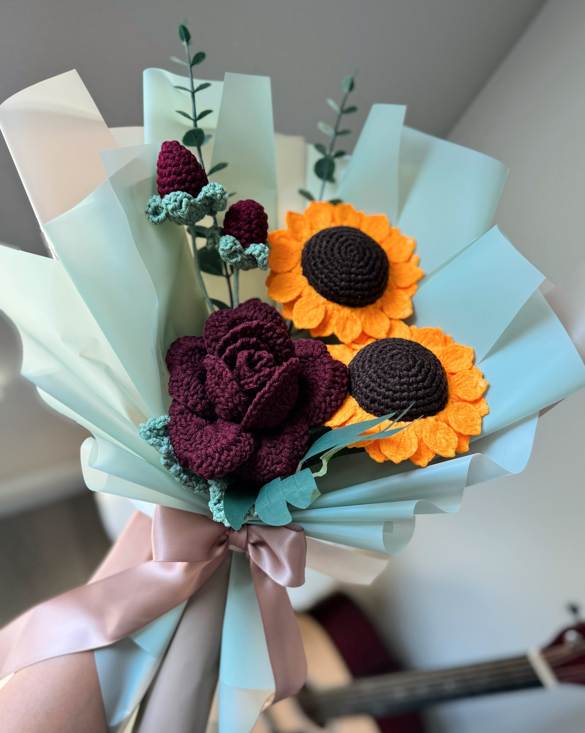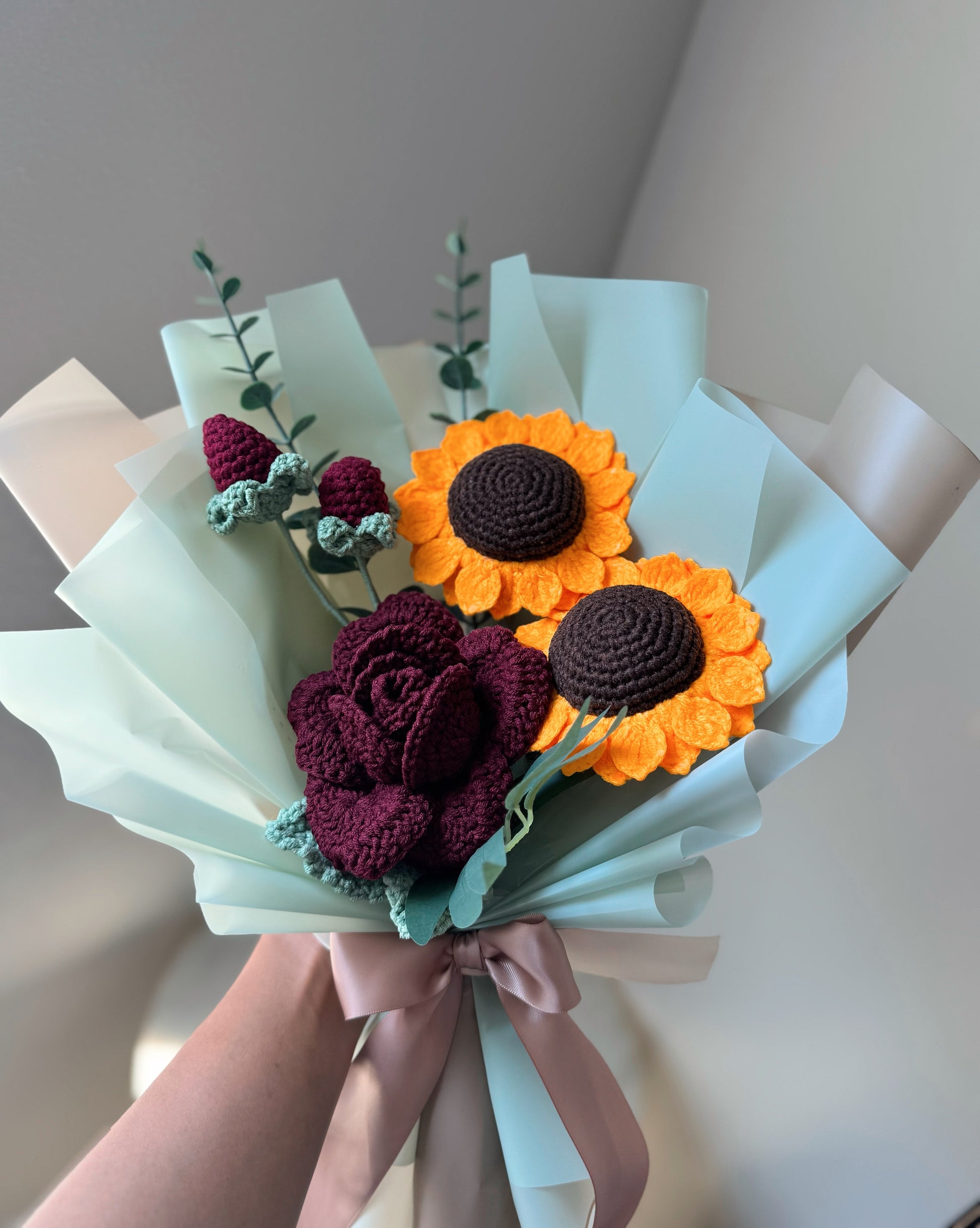 A beautifully handcrafted crochet bouquet featuring deep red wine roses paired with bright golden sunflowers. The rich contrast of colors brings together elegance and warmth, making it a perfect gift for celebrating love, joy, and new beginnings.