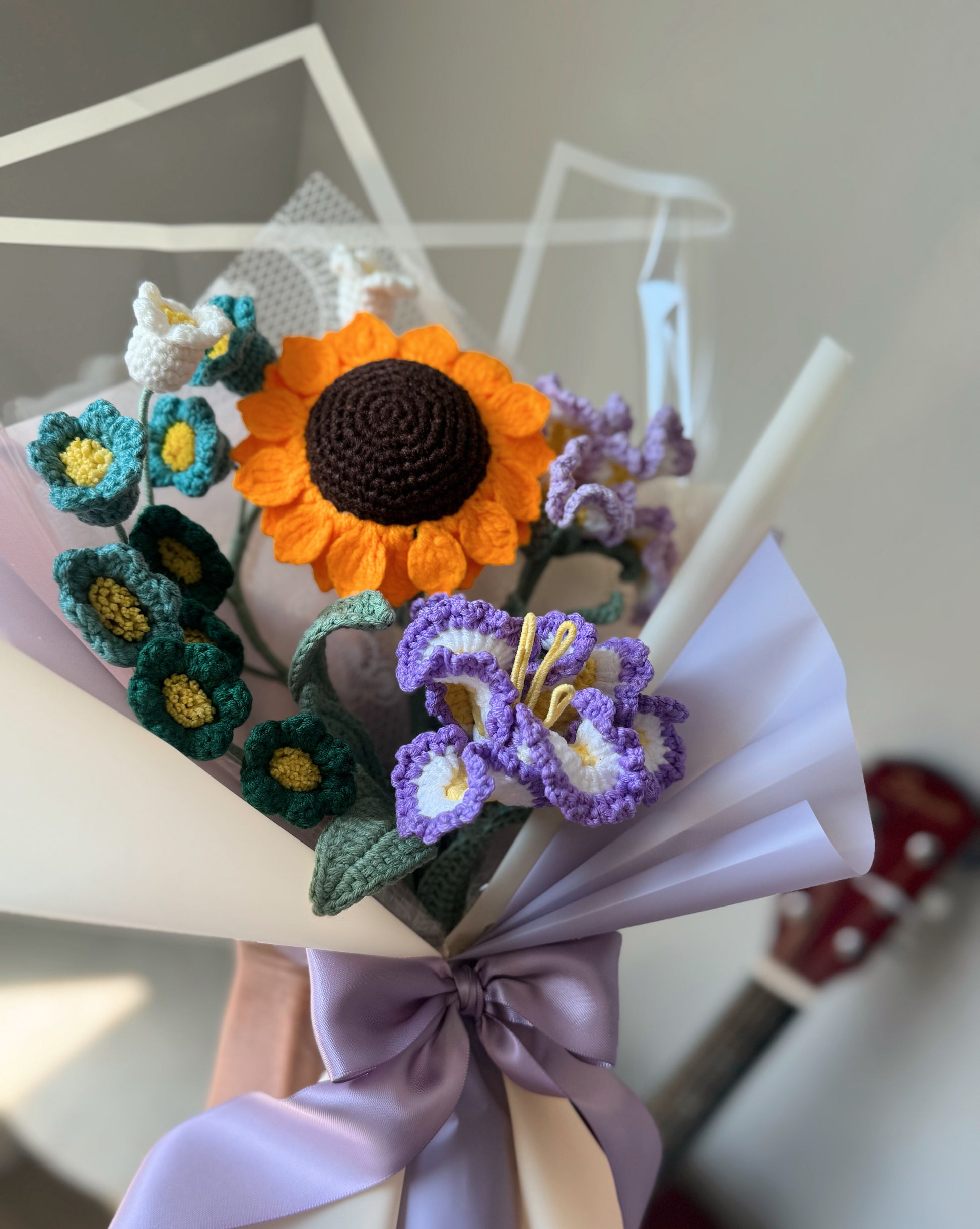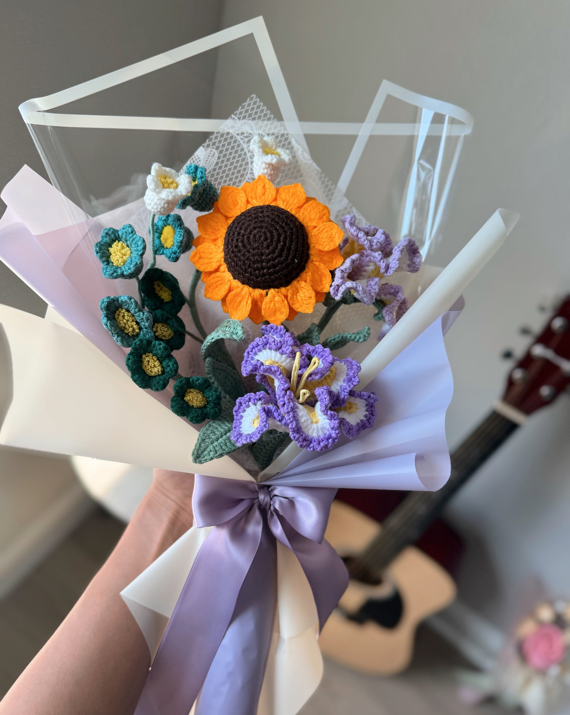 A bold and elegant handmade crochet bouquet featuring a radiant sunflower at the center, paired with vibrant purple irises and unique green lily of the valley. Wrapped with soft lavender tones, this bouquet blends charm, strength, and fresh beauty — a perfect gift to brighten the day. 🌻💜🌿