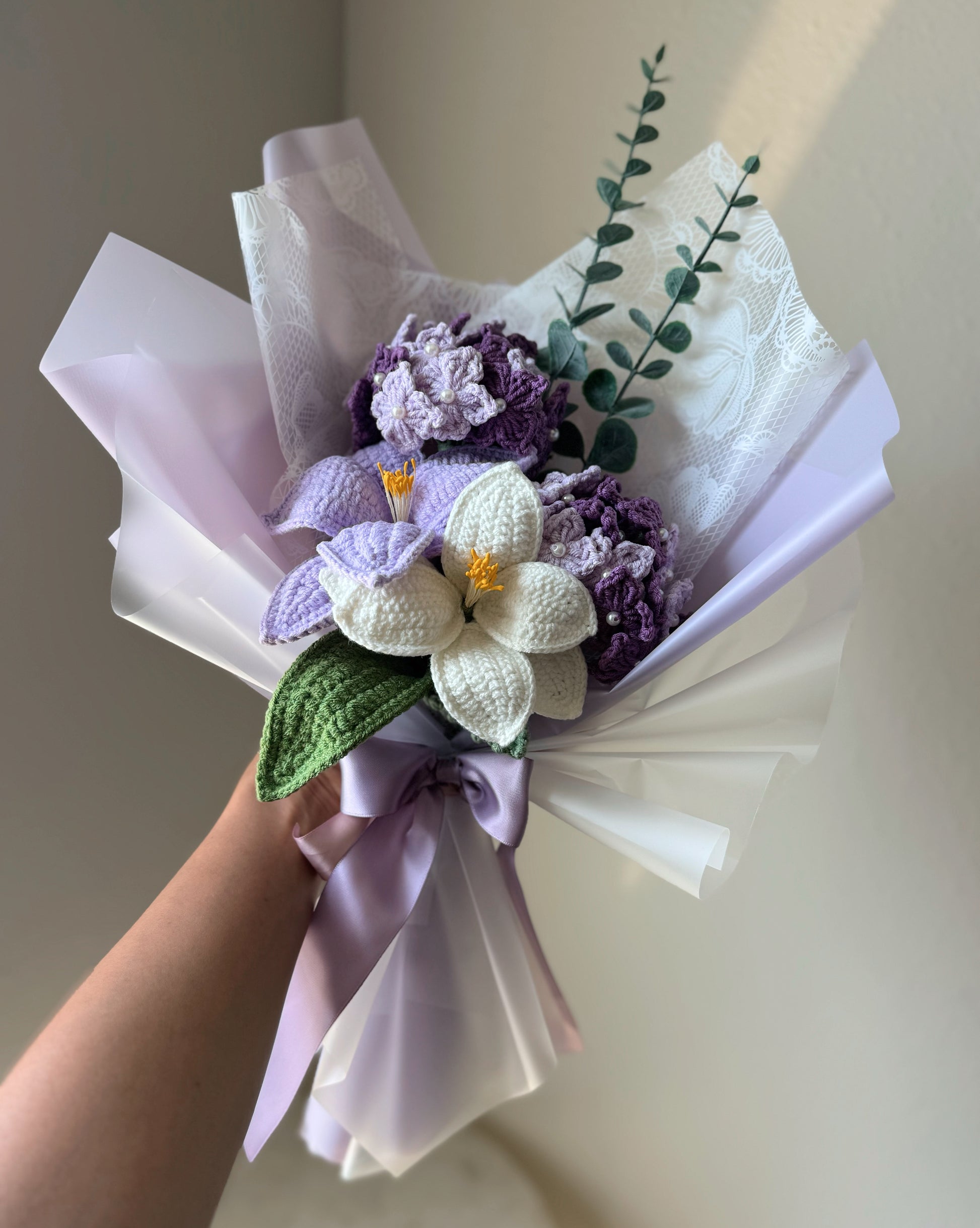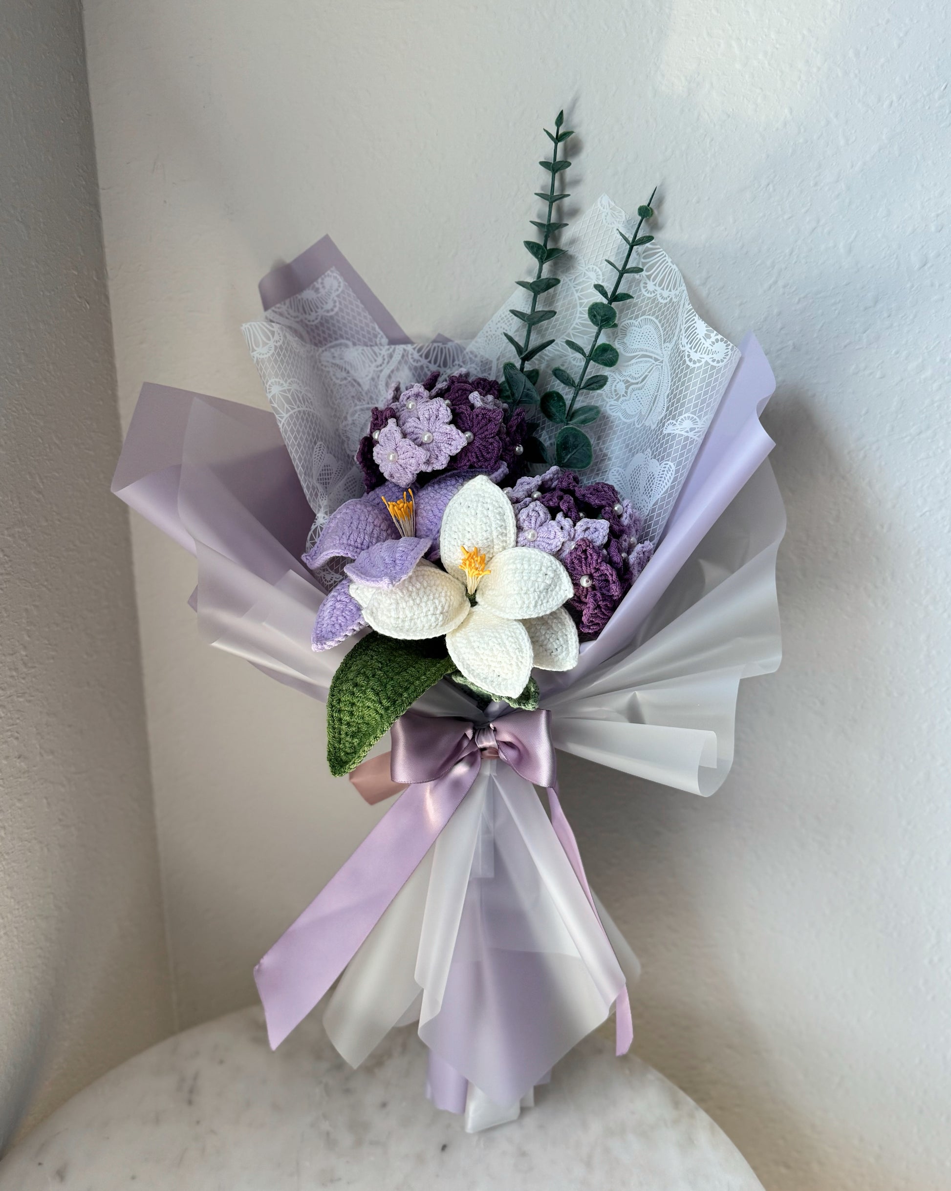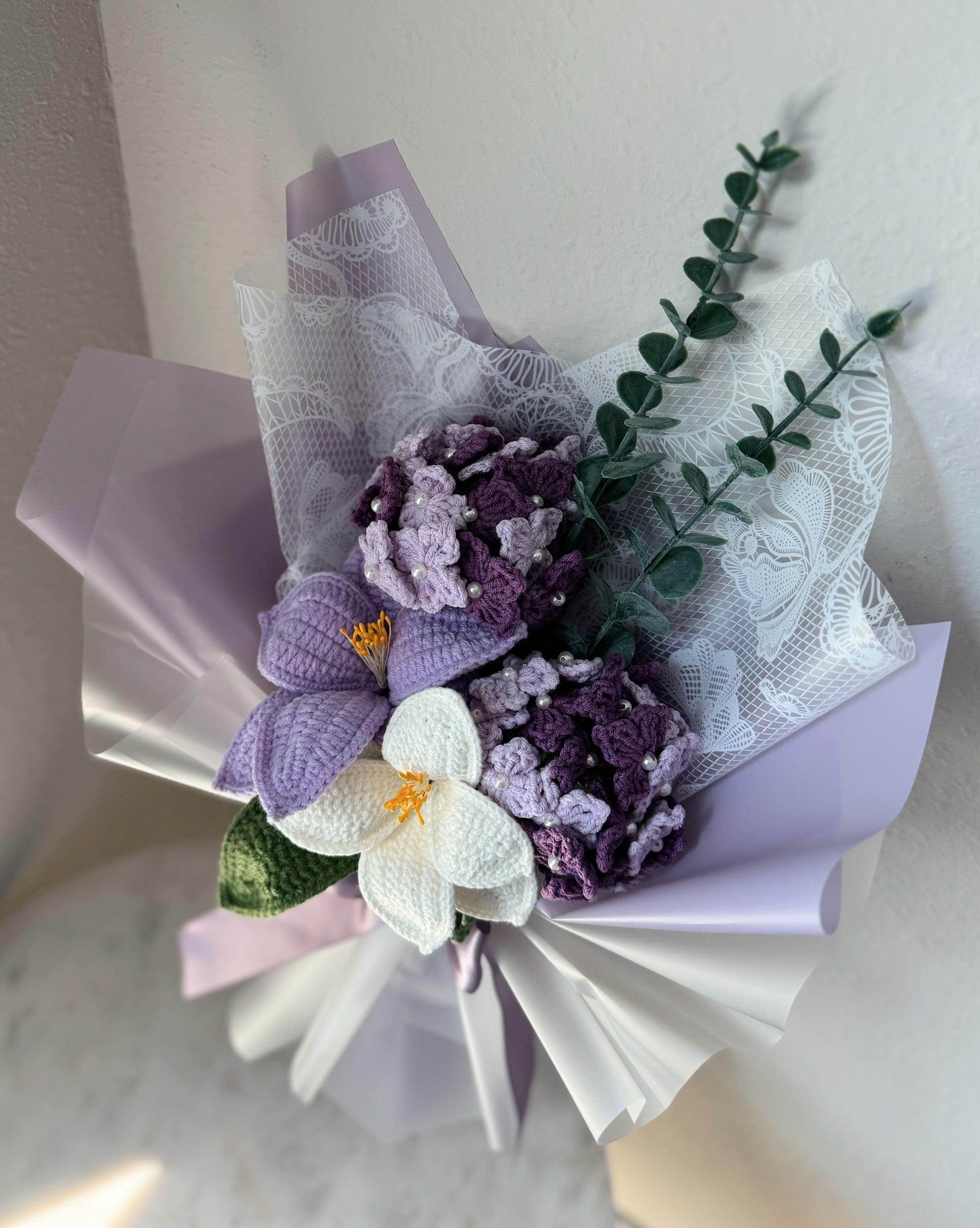 A graceful bouquet featuring soft purple hydrangeas and delicate white and lavender wild lilies. This arrangement captures the quiet beauty of dusk, where the colors of twilight bring peace, calm, and gentle elegance. Perfect for gifting love, gratitude, or simply a touch of serenity to any space.