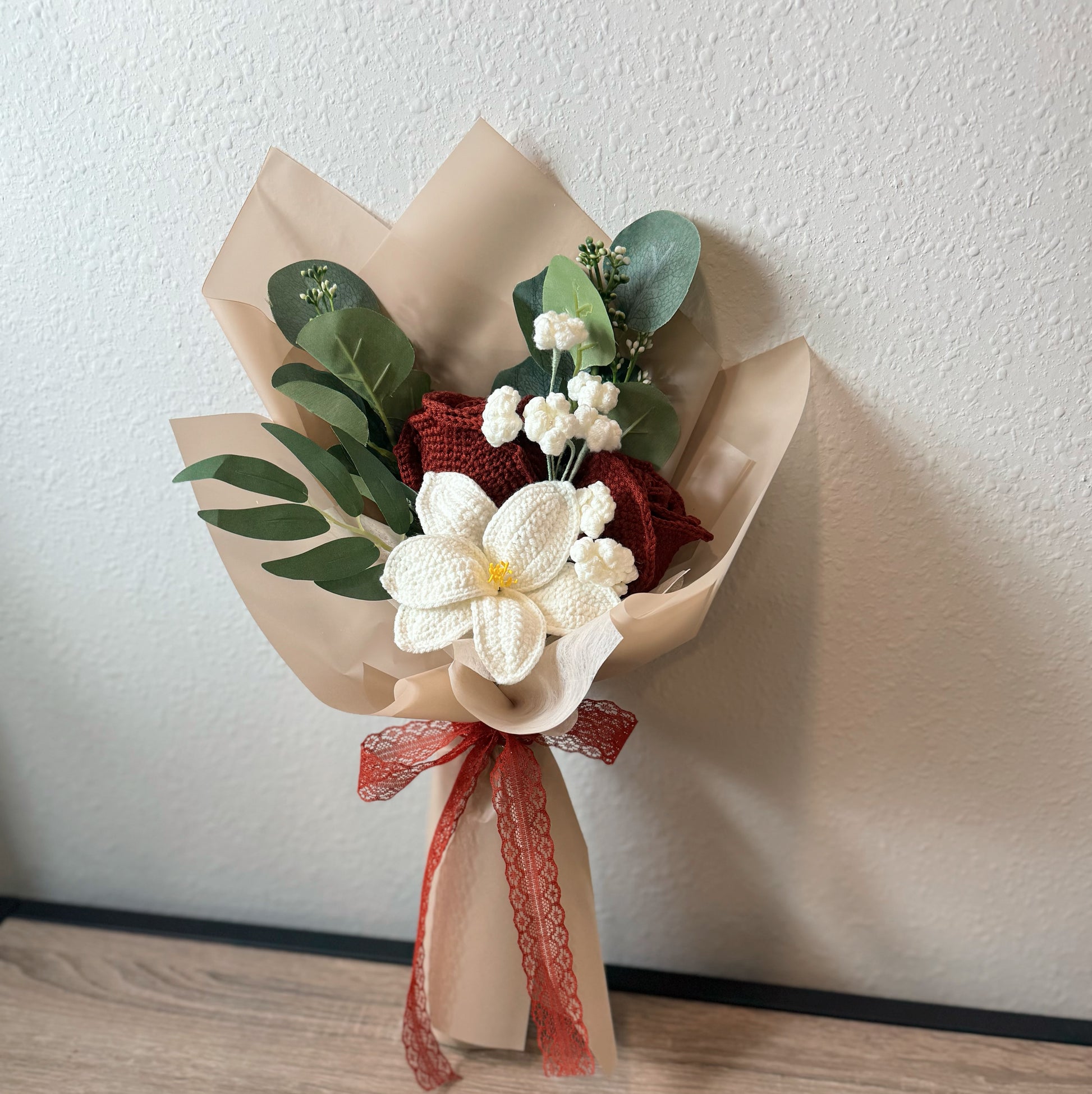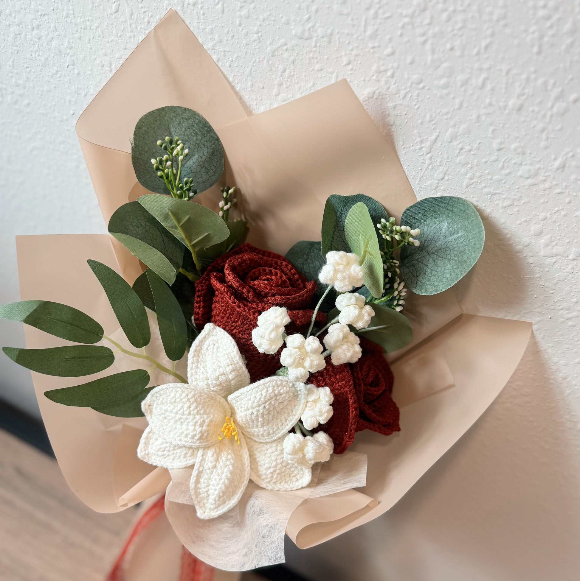 A timeless and romantic bouquet featuring deep red wine roses, symbolizing passion and elegance, beautifully paired with a pure white lily, representing devotion and grace. Accented with delicate baby’s breath and lush greenery, this arrangement blends bold richness with soft purity. Perfect for heartfelt occasions, it captures both love’s intensity and serenity in one elegant design.