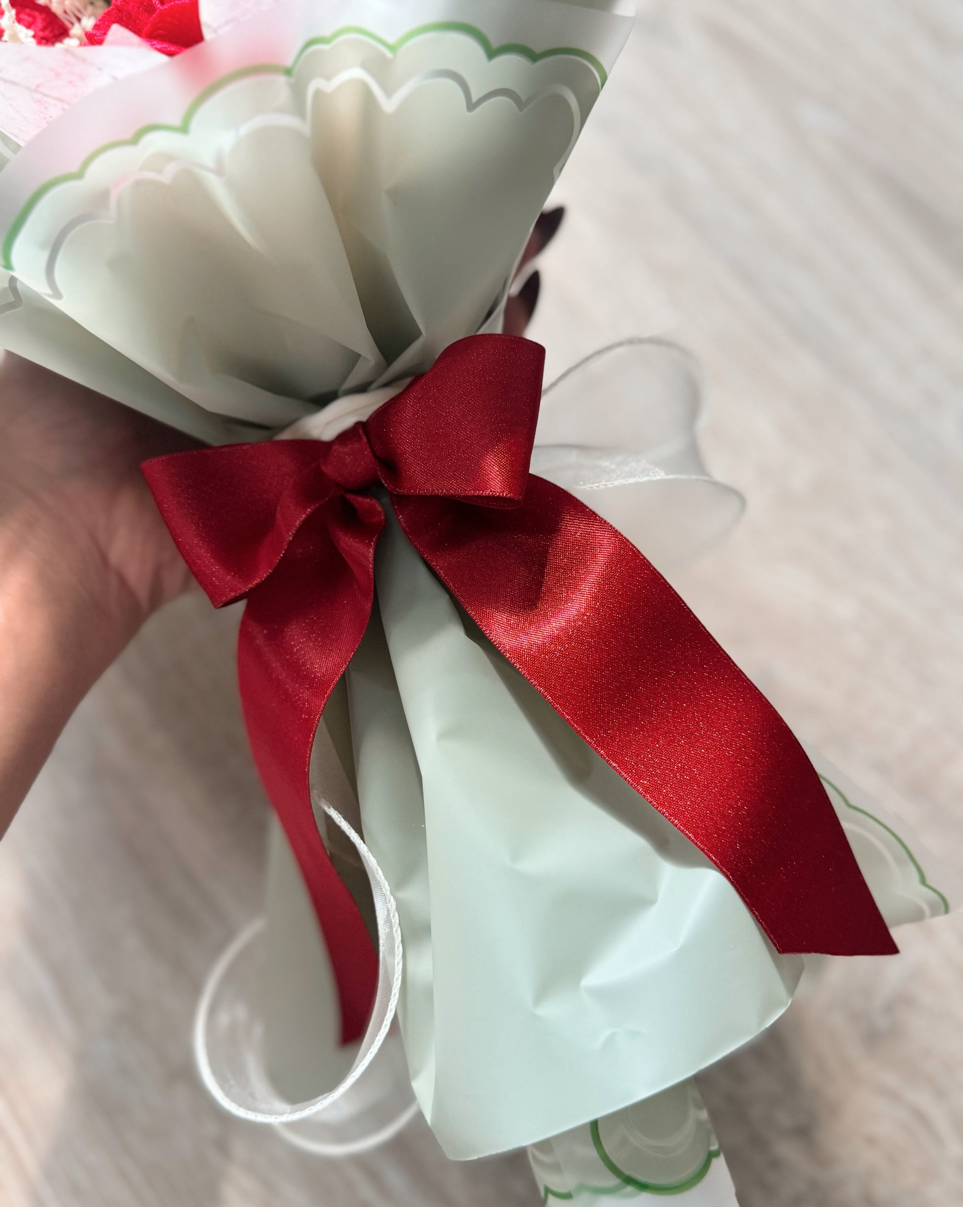A timeless and festive arrangement featuring handmade detailed crochet roses in classic red and soft cream, complemented with gentle winter greenery and delicate white fillers. Wrapped in frosted mint paper and finished with a rich red satin bow, this bouquet brings a graceful holiday charm perfect for gifting, décor, or celebrating the beauty of the season.